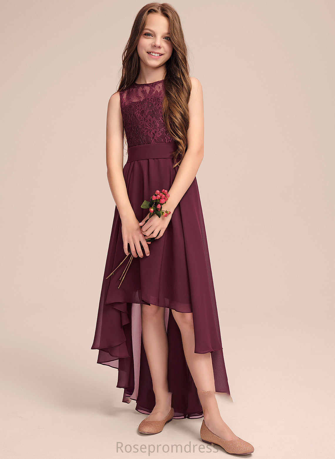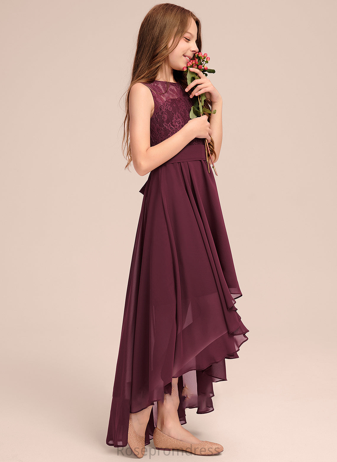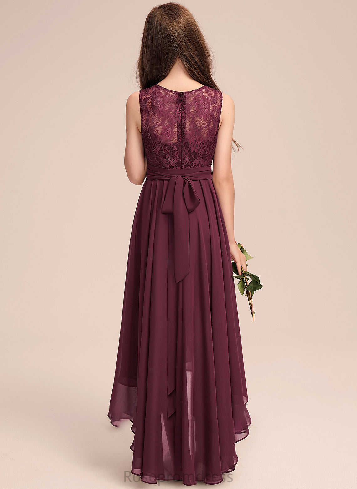 Janey A-Line Asymmetrical Neck Junior Bridesmaid Dresses Bow(s) Scoop Lace With Chiffon