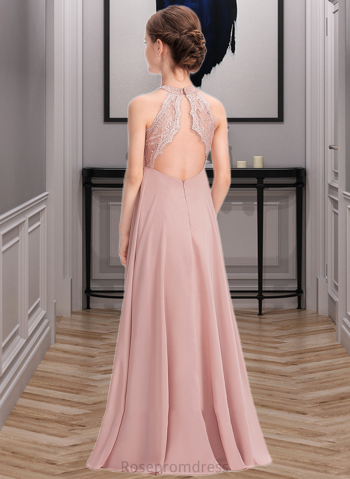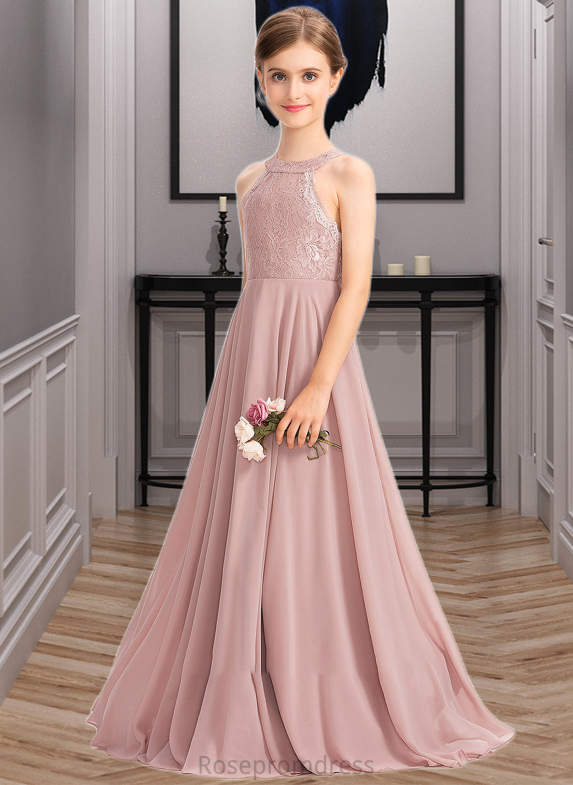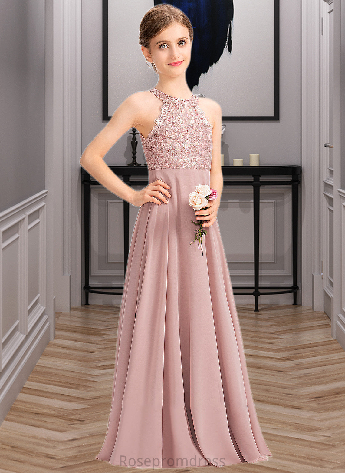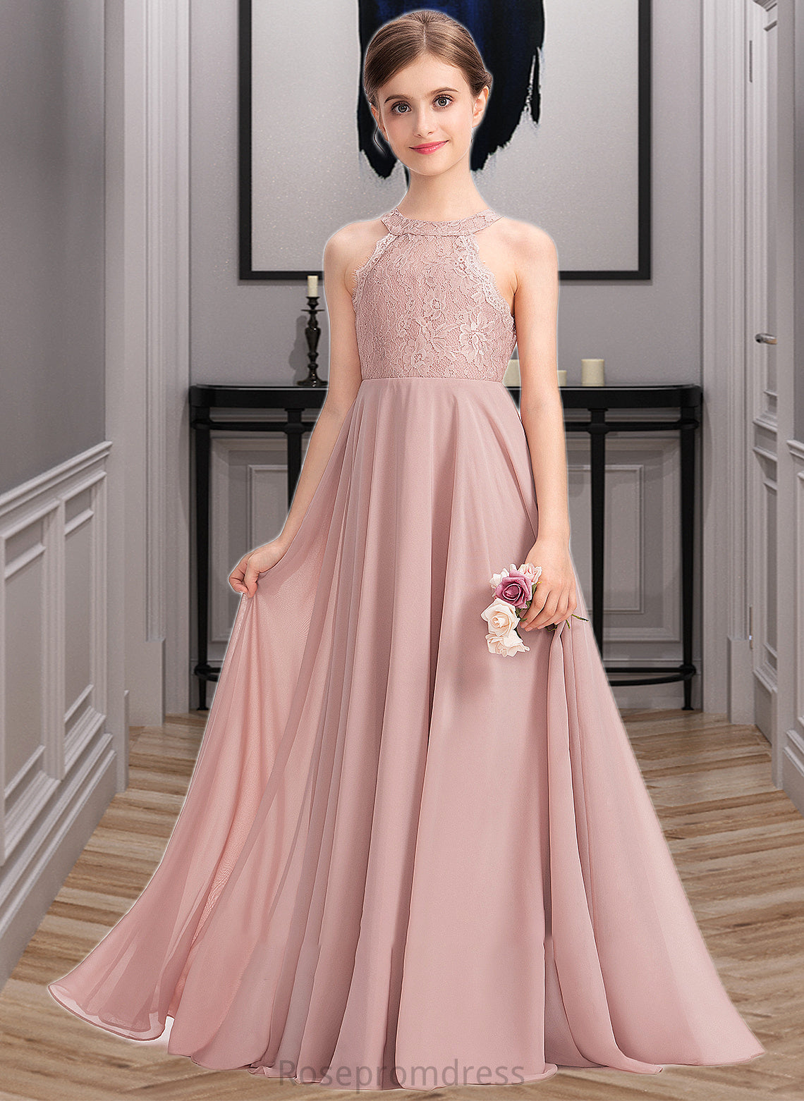 Janiah A-Line Scoop Neck Floor-Length Chiffon Lace Junior Bridesmaid Dress SRSP0013324