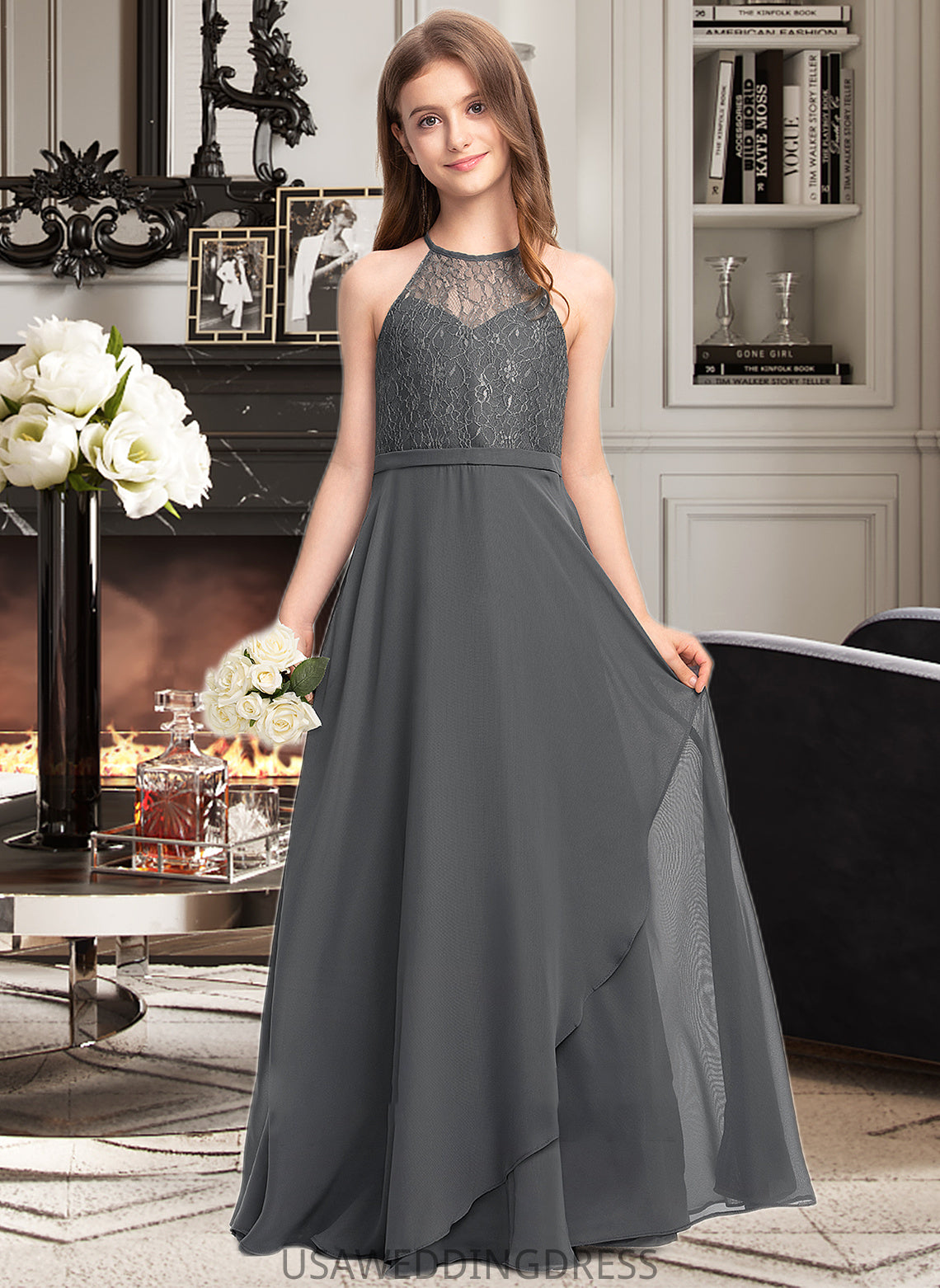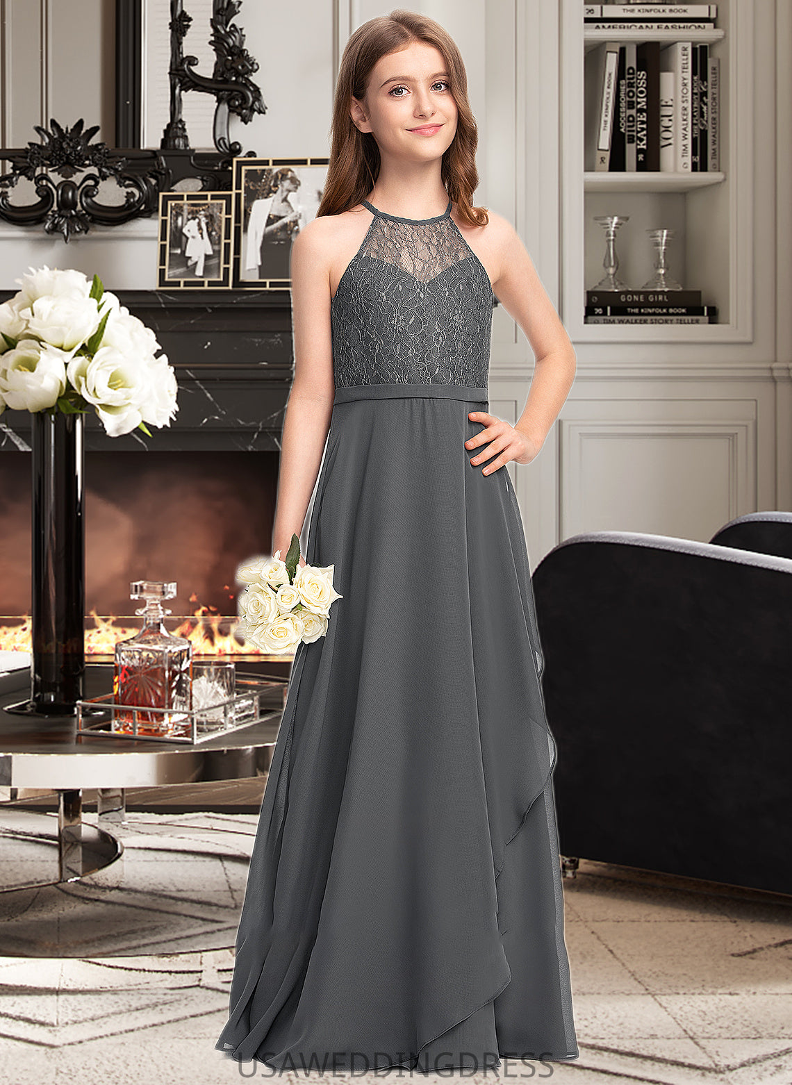 Jayden A-Line Scoop Neck Floor-Length Chiffon Lace Junior Bridesmaid Dress With Cascading Ruffles DSP0013389