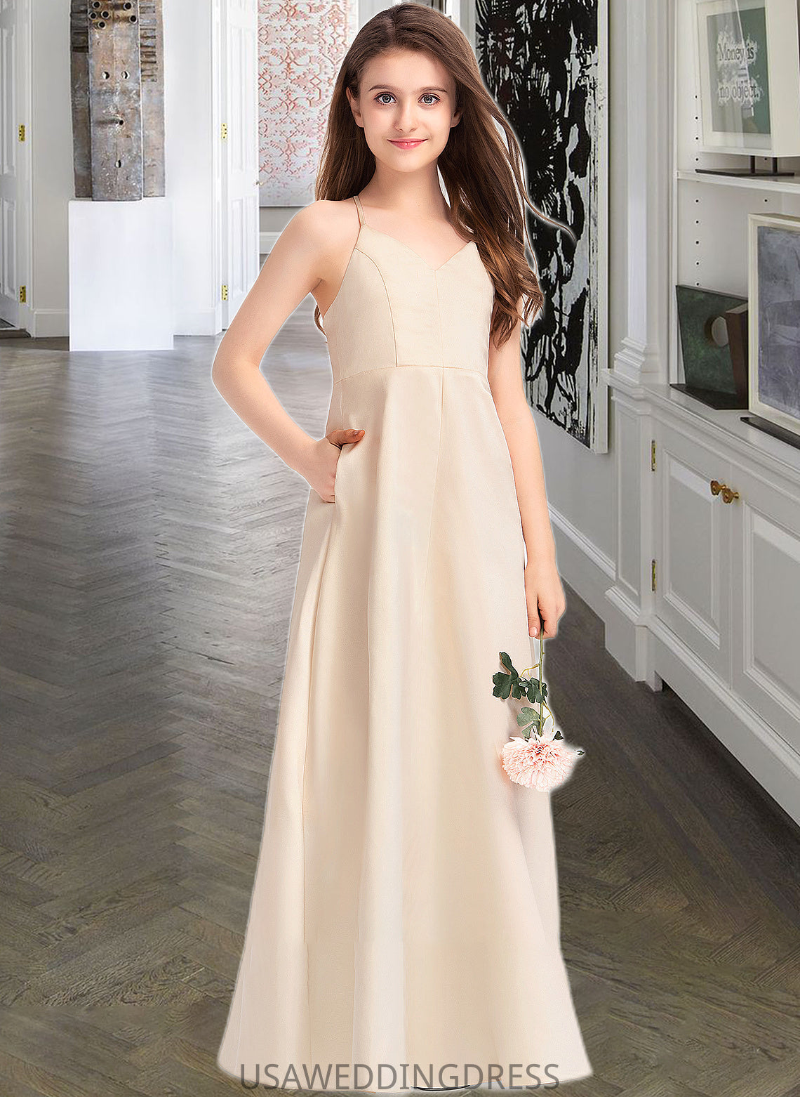 Jaylee A-Line V-neck Floor-Length Satin Junior Bridesmaid Dress With Pockets DSP0013319