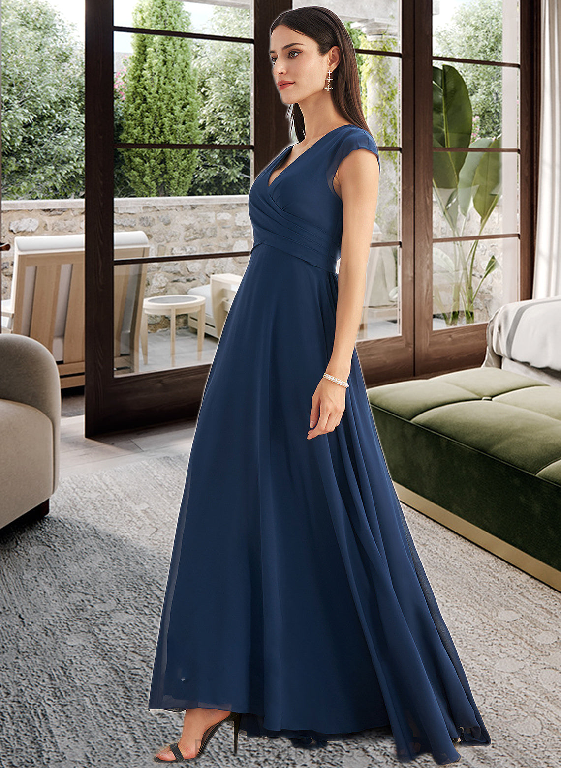 Jazmyn A-Line V-neck Floor-Length Bridesmaid Dress With Ruffle SRSP0012986