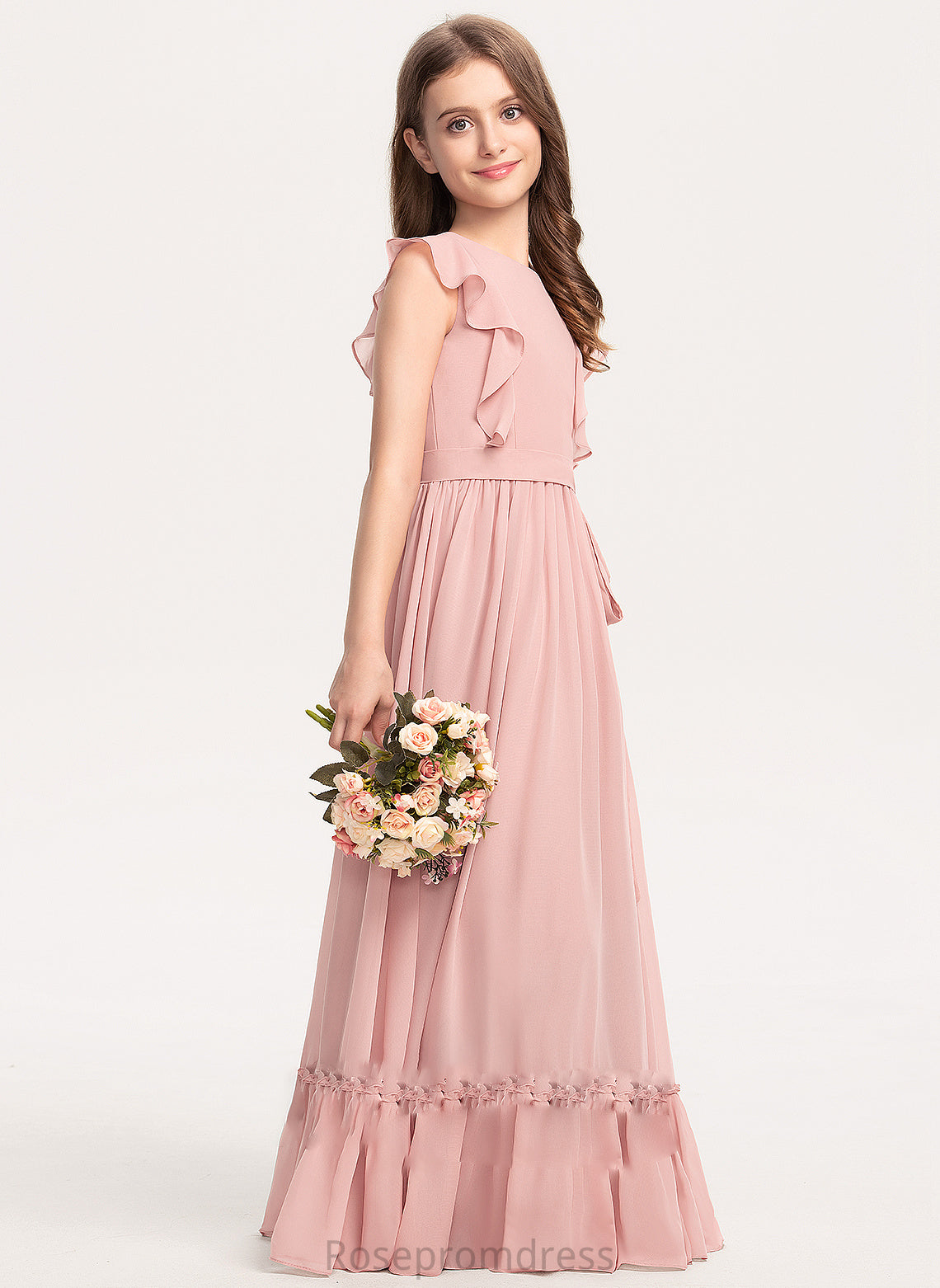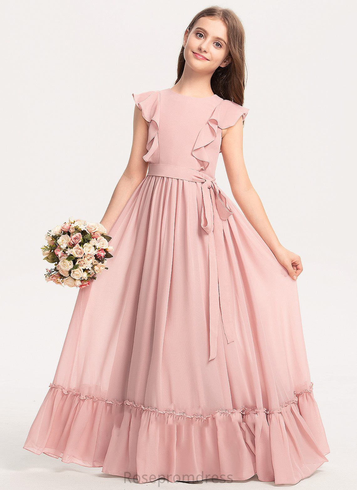 Jean Floor-Length With Scoop A-Line Chiffon Cascading Bow(s) Neck Junior Bridesmaid Dresses Ruffles