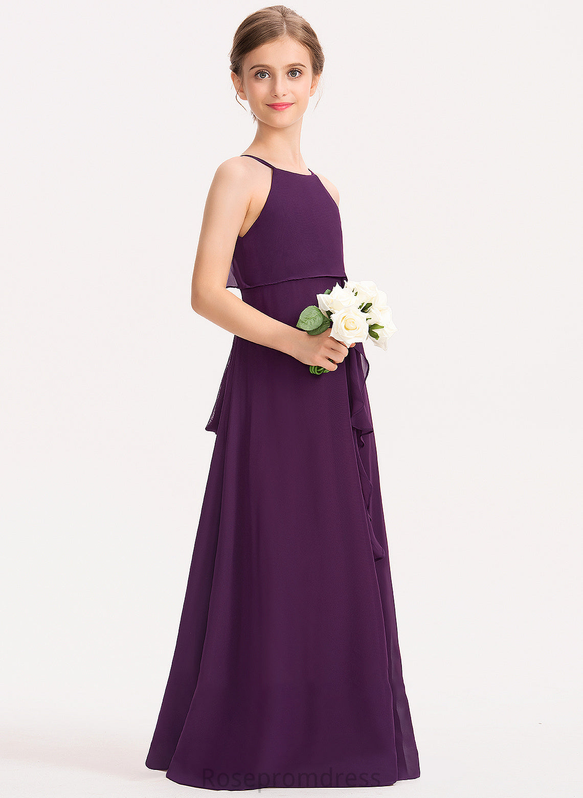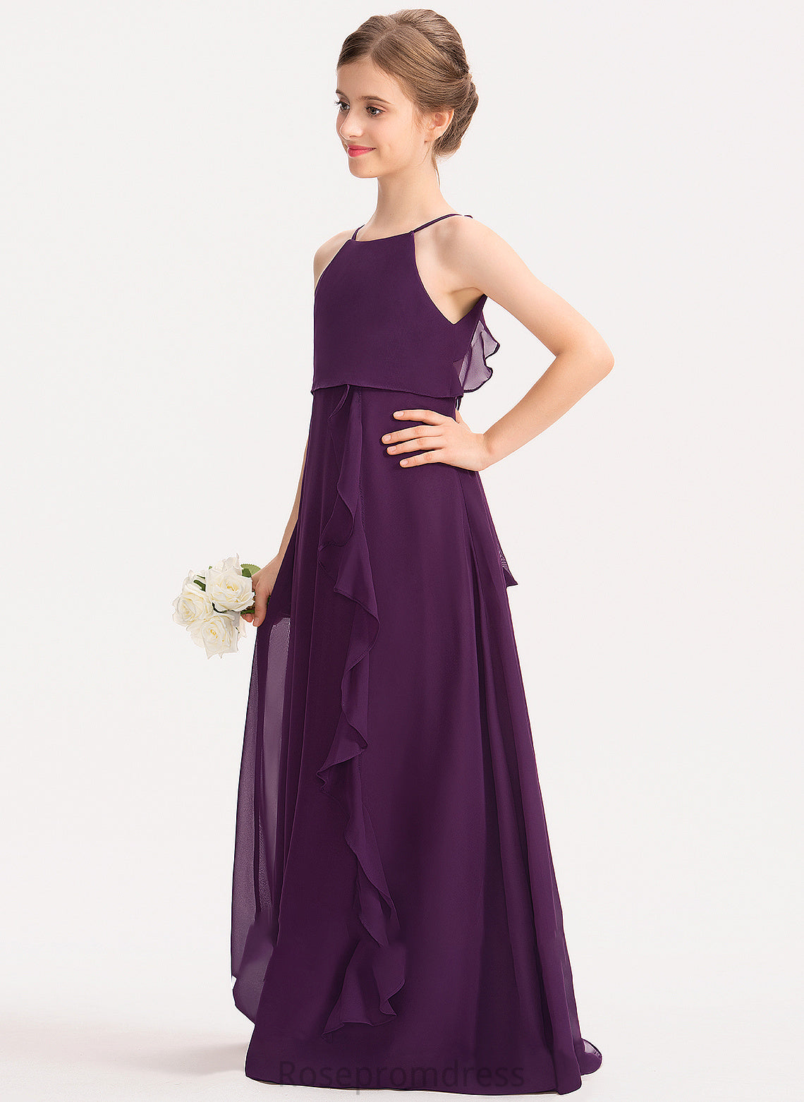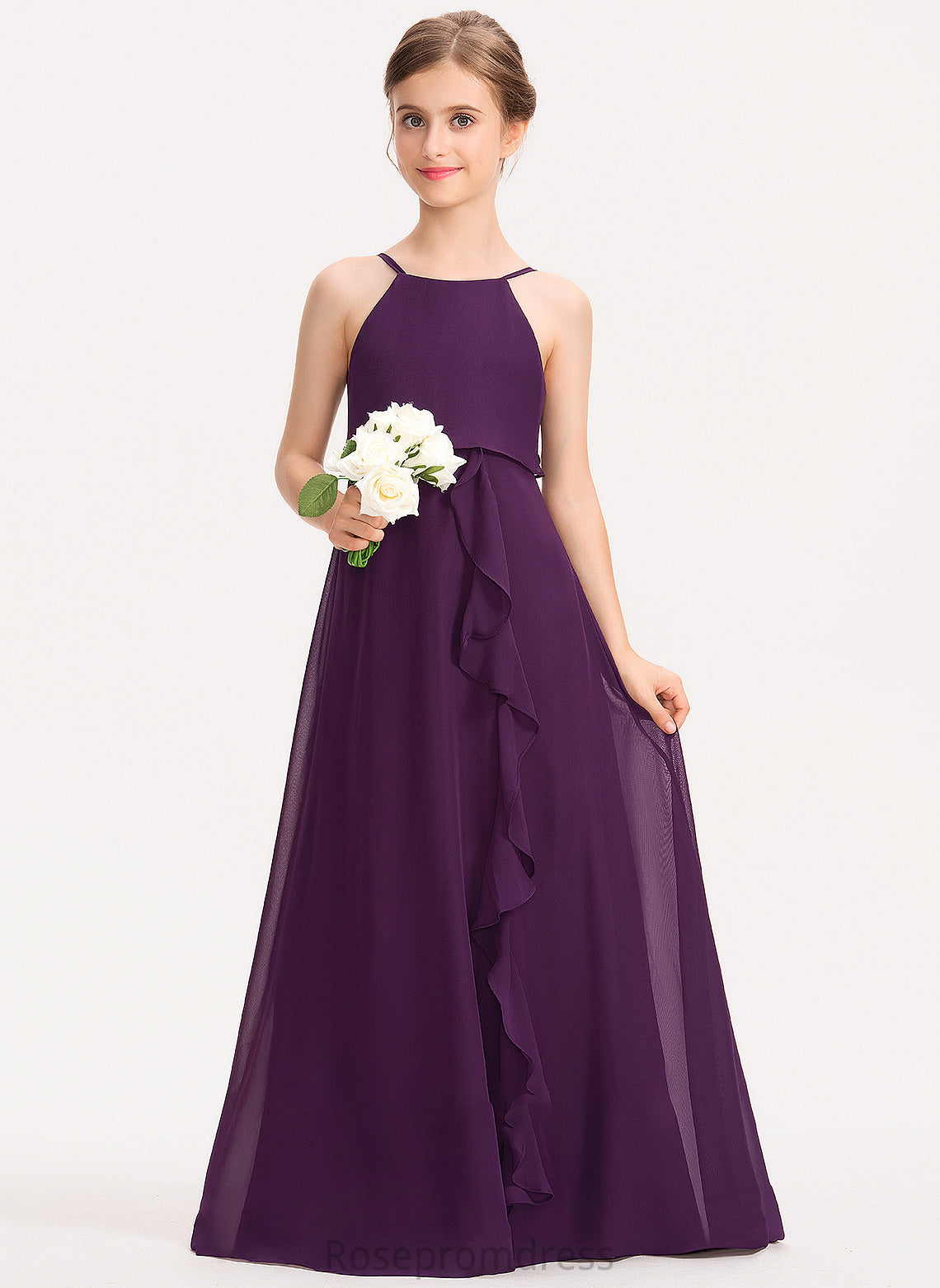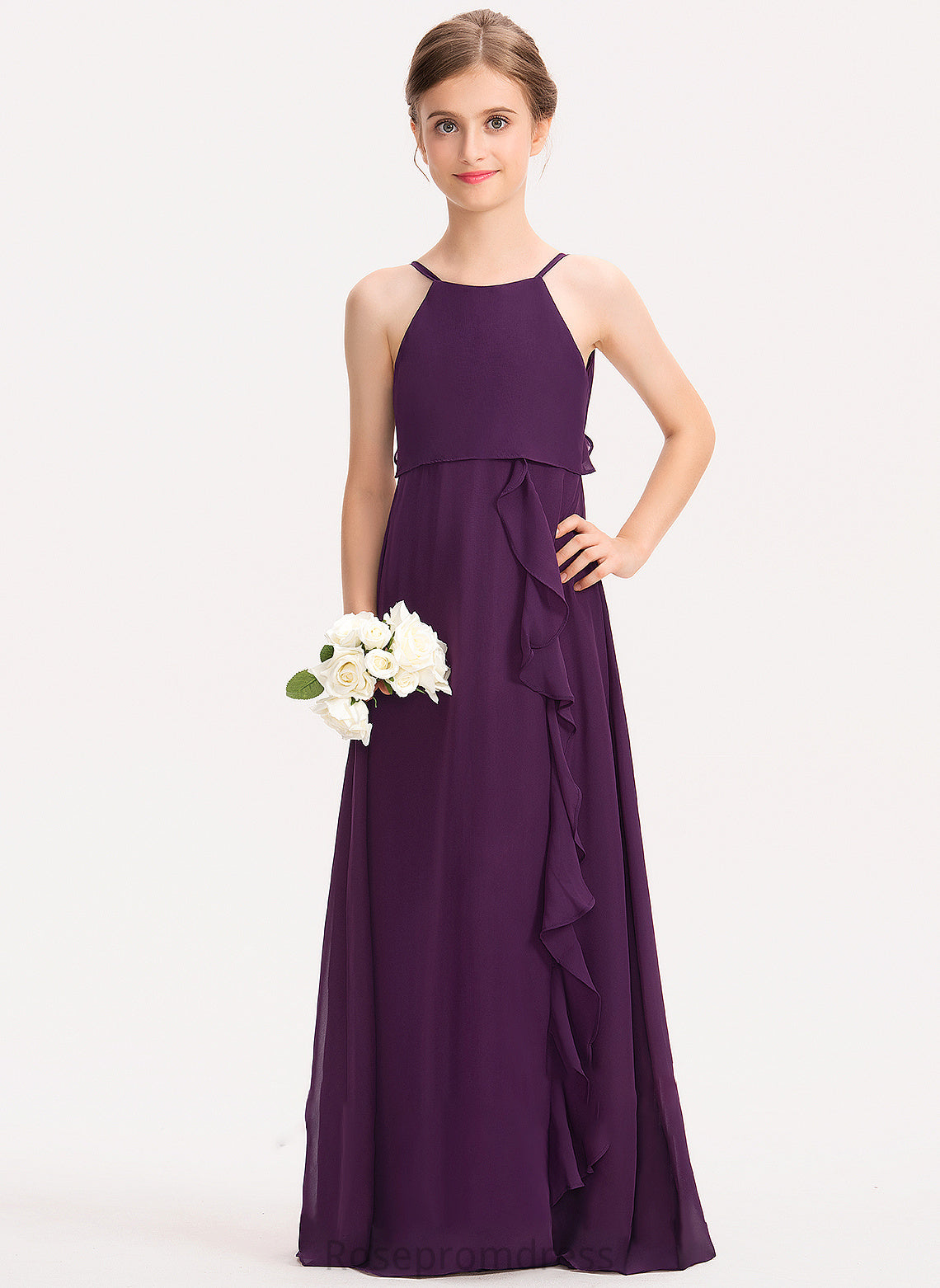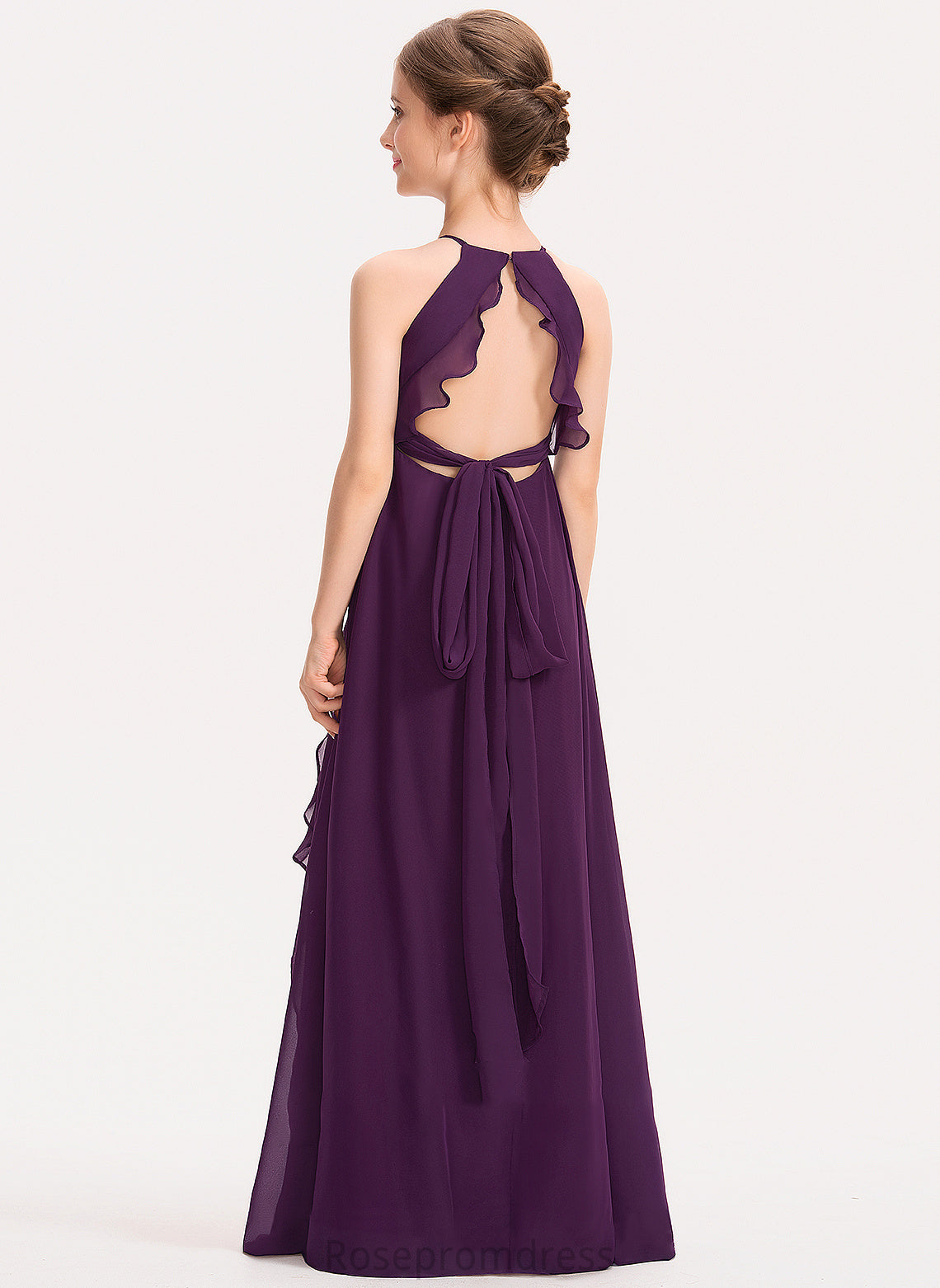 Junior Bridesmaid Dresses Scoop Cascading Ruffles Neck Ayla A-Line With Floor-Length Chiffon Bow(s)