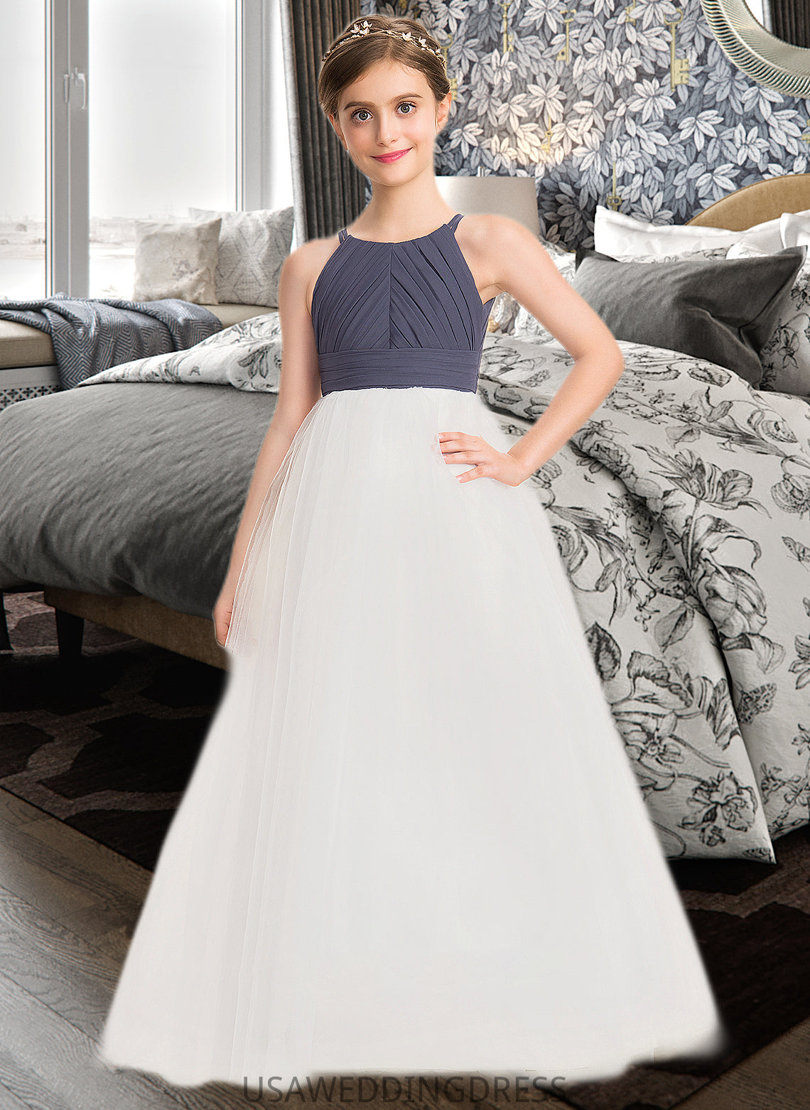 Karen A-Line Scoop Neck Floor-Length Chiffon Tulle Junior Bridesmaid Dress With Ruffle DSP0013629