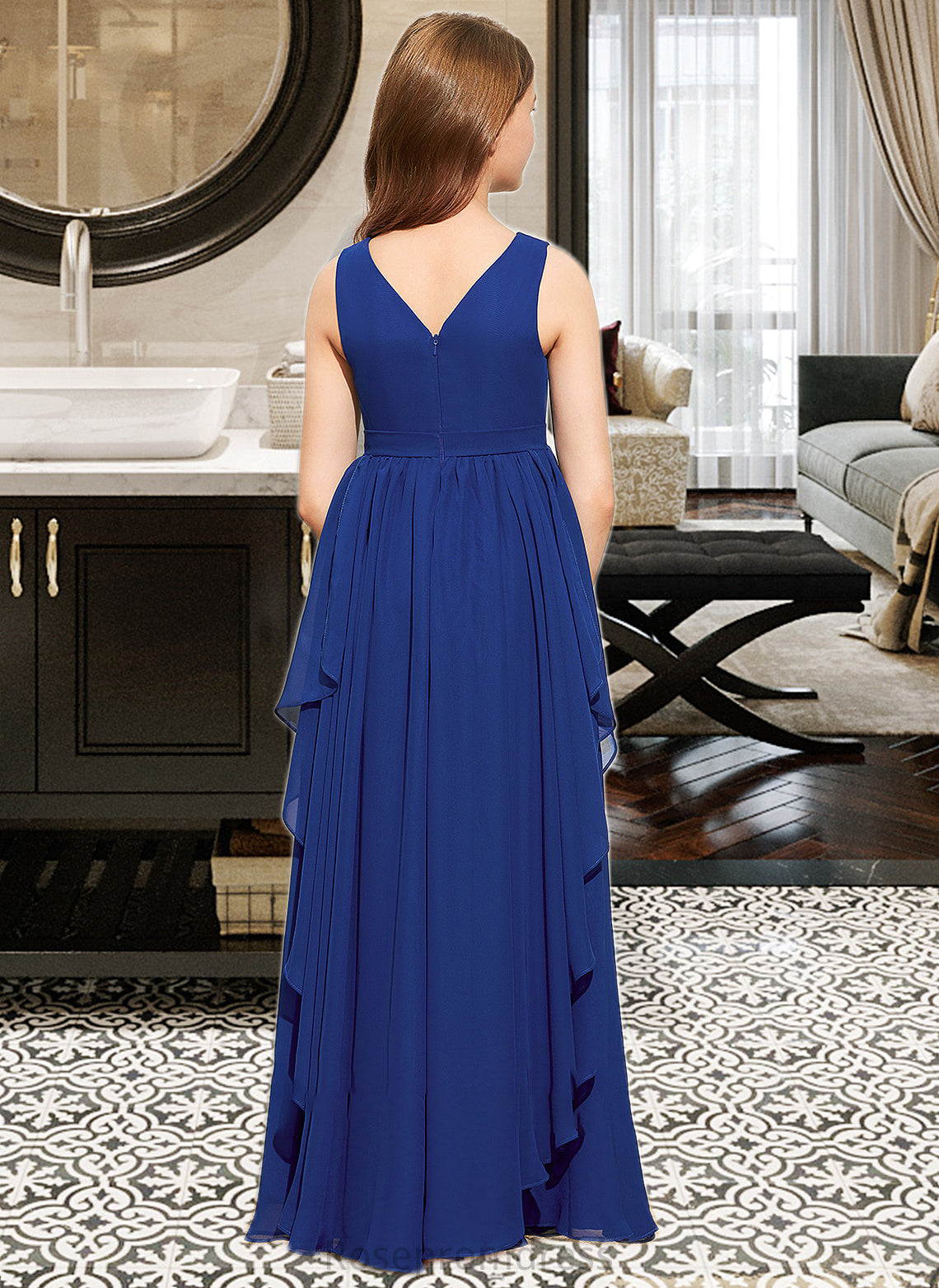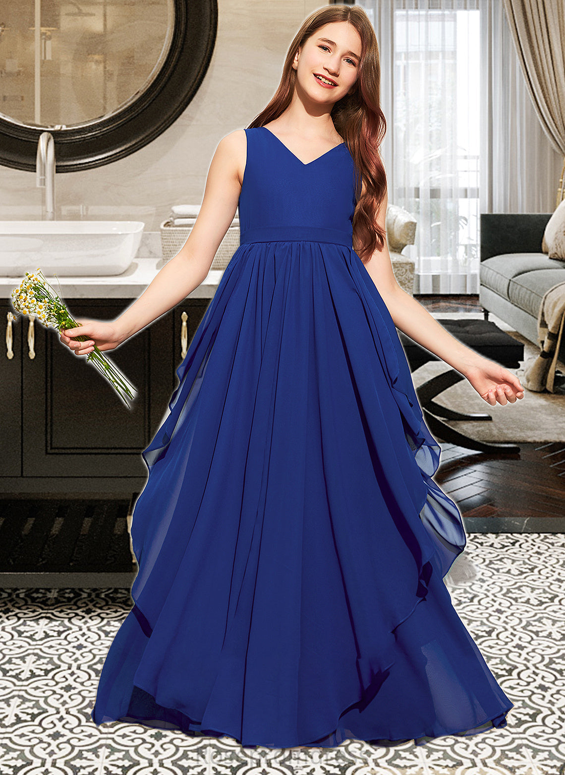 Karma A-Line V-neck Floor-Length Chiffon Junior Bridesmaid Dress With Cascading Ruffles SRSP0013381