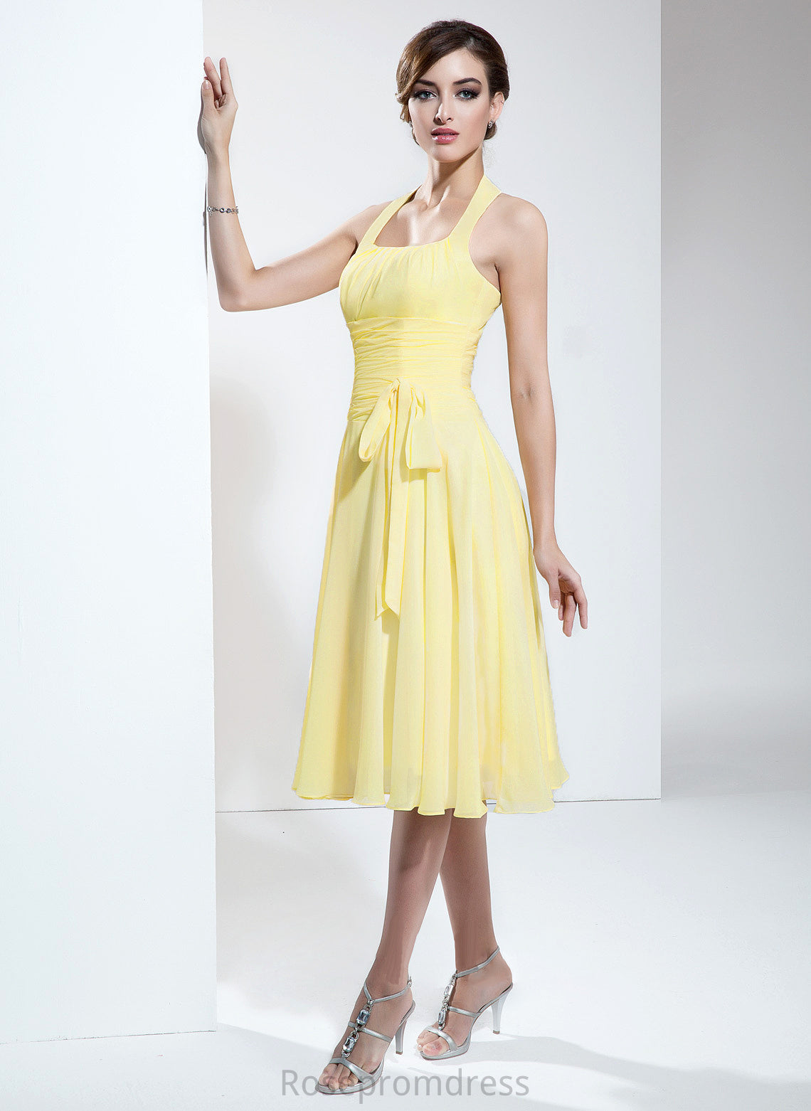 Knee-Length Fabric Neckline Embellishment A-Line Silhouette Ruffle Bow(s) Halter Length Virginia V-Neck Bridesmaid Dresses