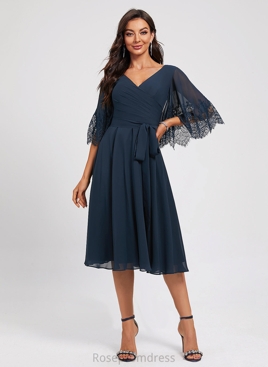 Knee-Length Lace Cocktail Sash With Layla Chiffon A-Line Pleated Cocktail Dresses V-neck Dress