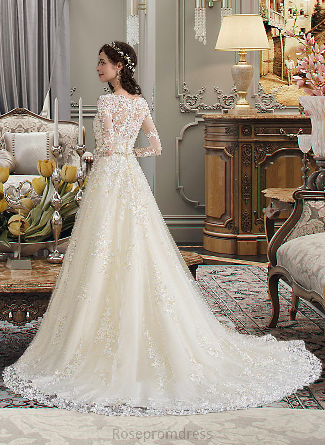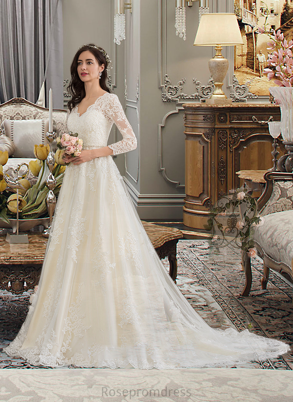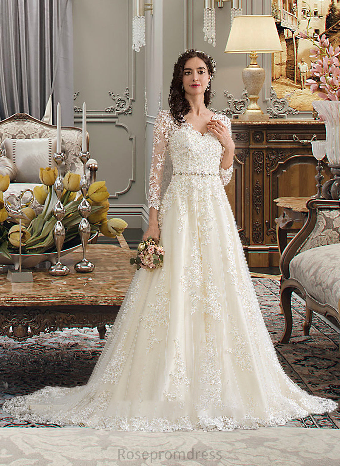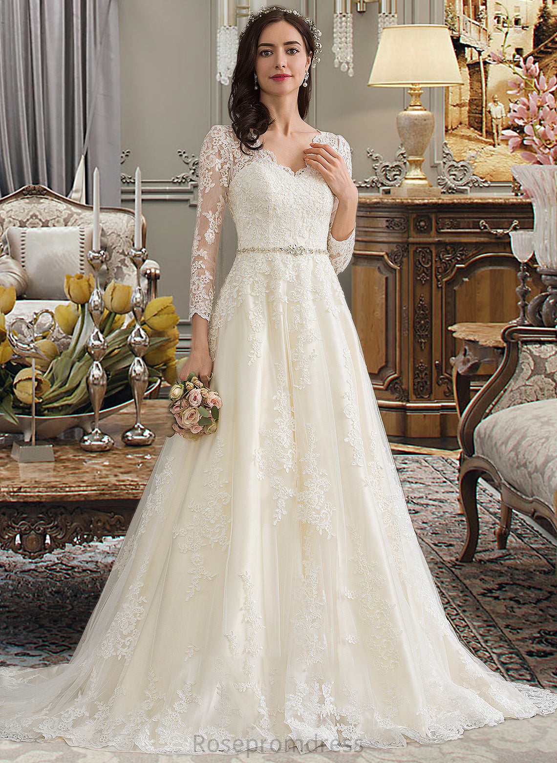 Kristina Ball-Gown/Princess V-neck Chapel Train Tulle Wedding Dress With Beading Sequins SRSP0013695