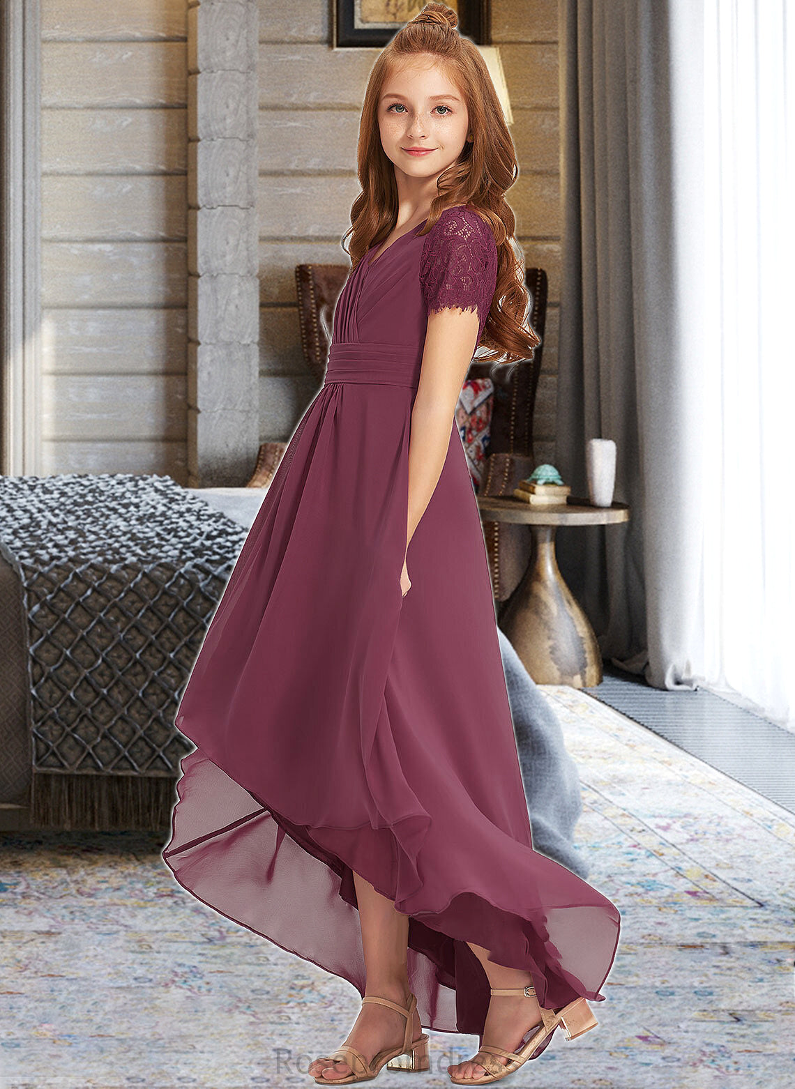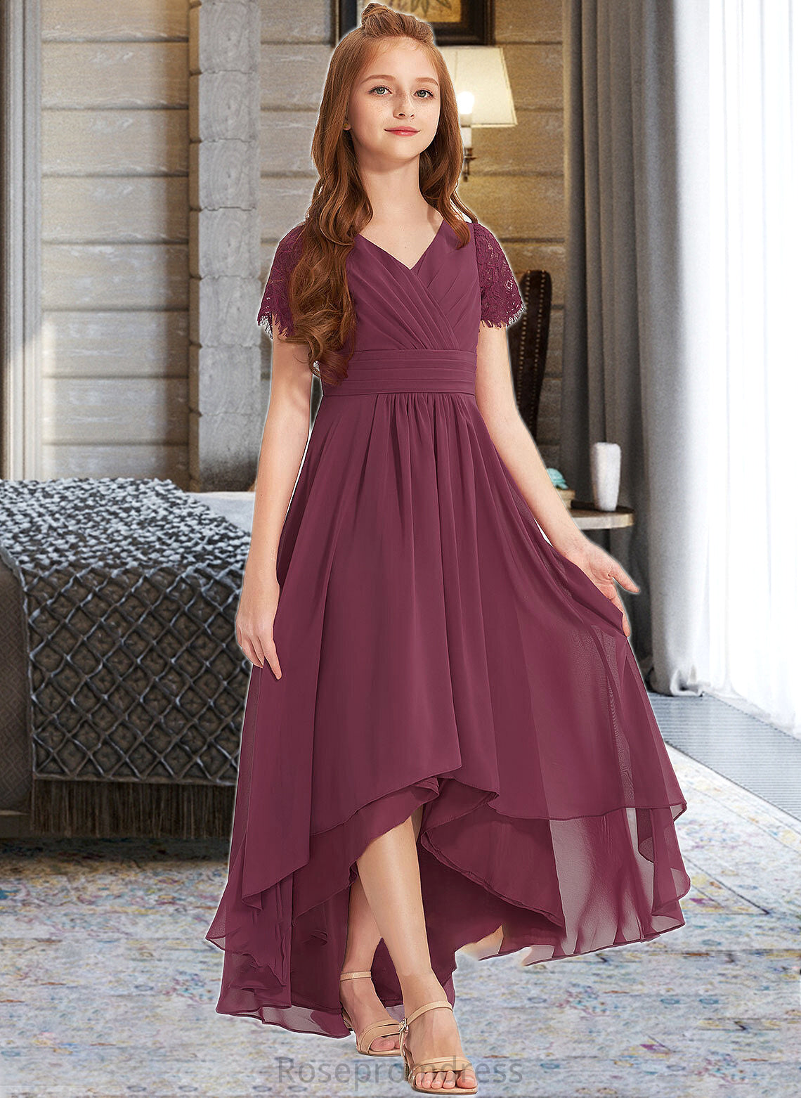 Kyla A-Line V-neck Asymmetrical Chiffon Lace Junior Bridesmaid Dress With Ruffle SRSP0013453