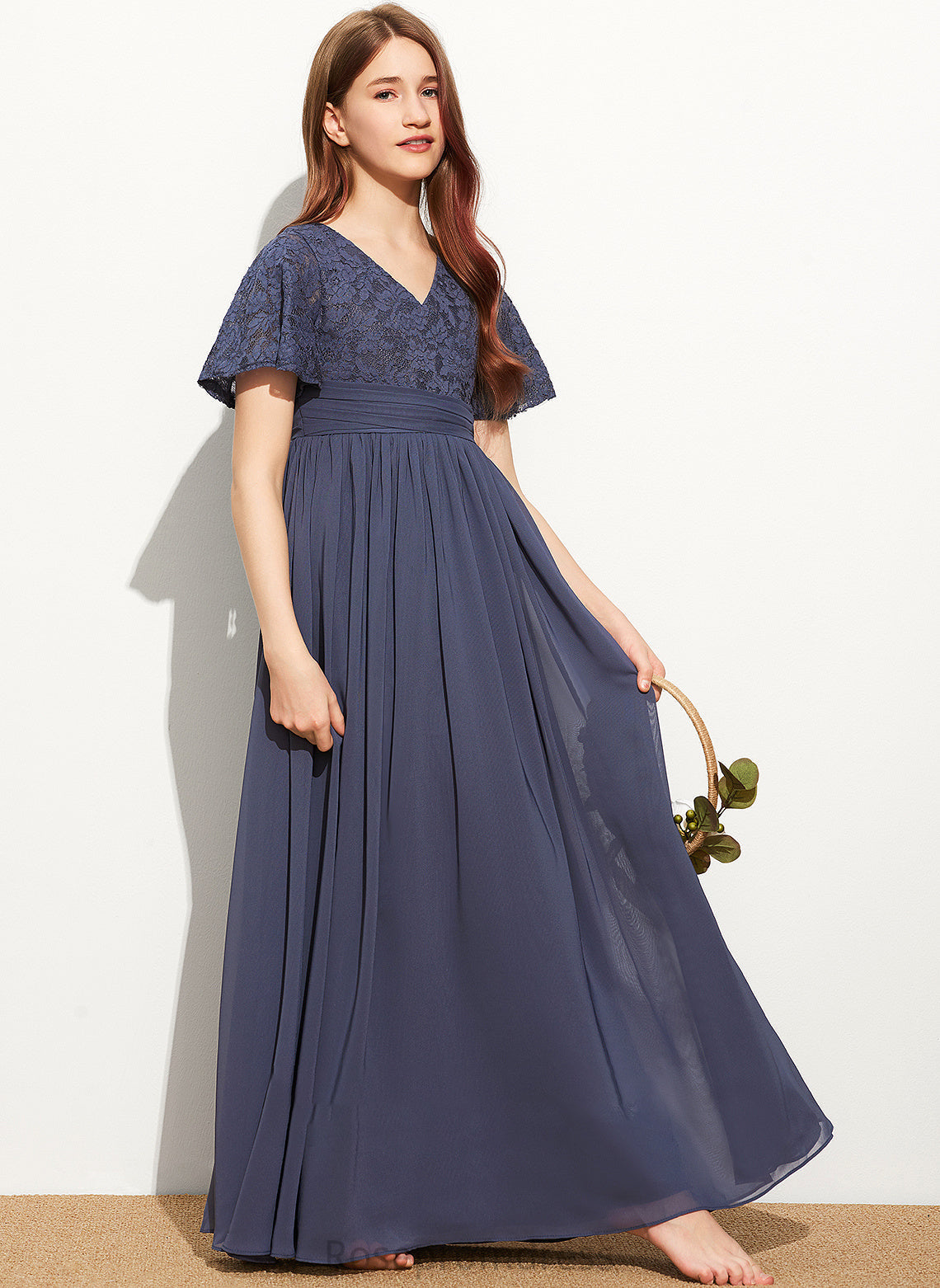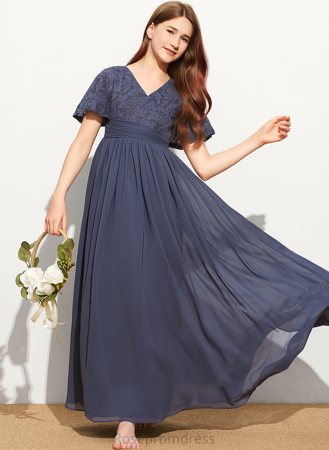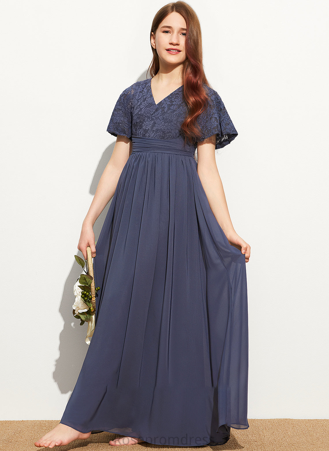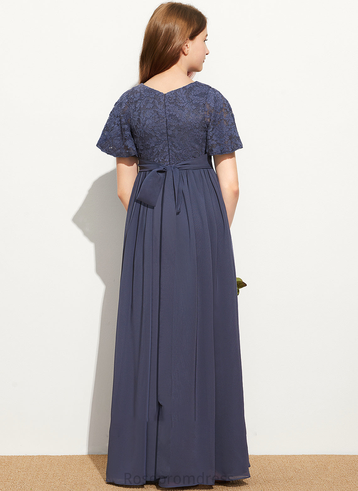 Lace Maci Junior Bridesmaid Dresses V-neck Chiffon Floor-Length With Bow(s) A-Line