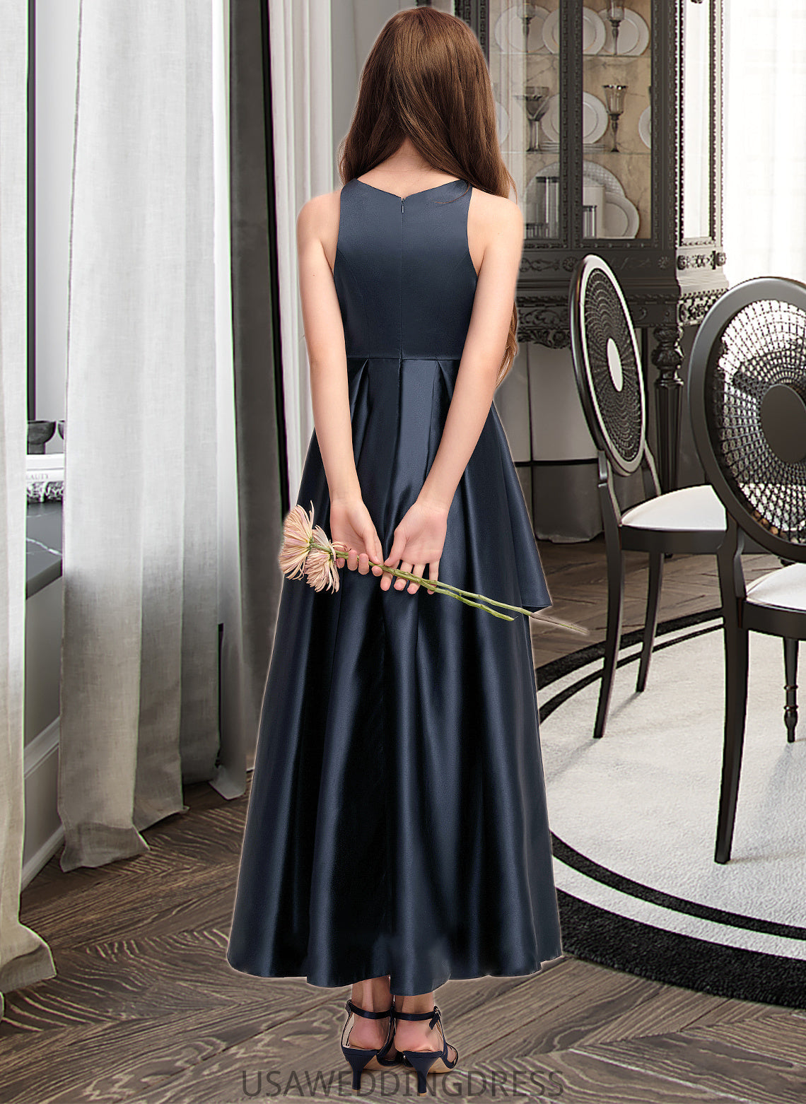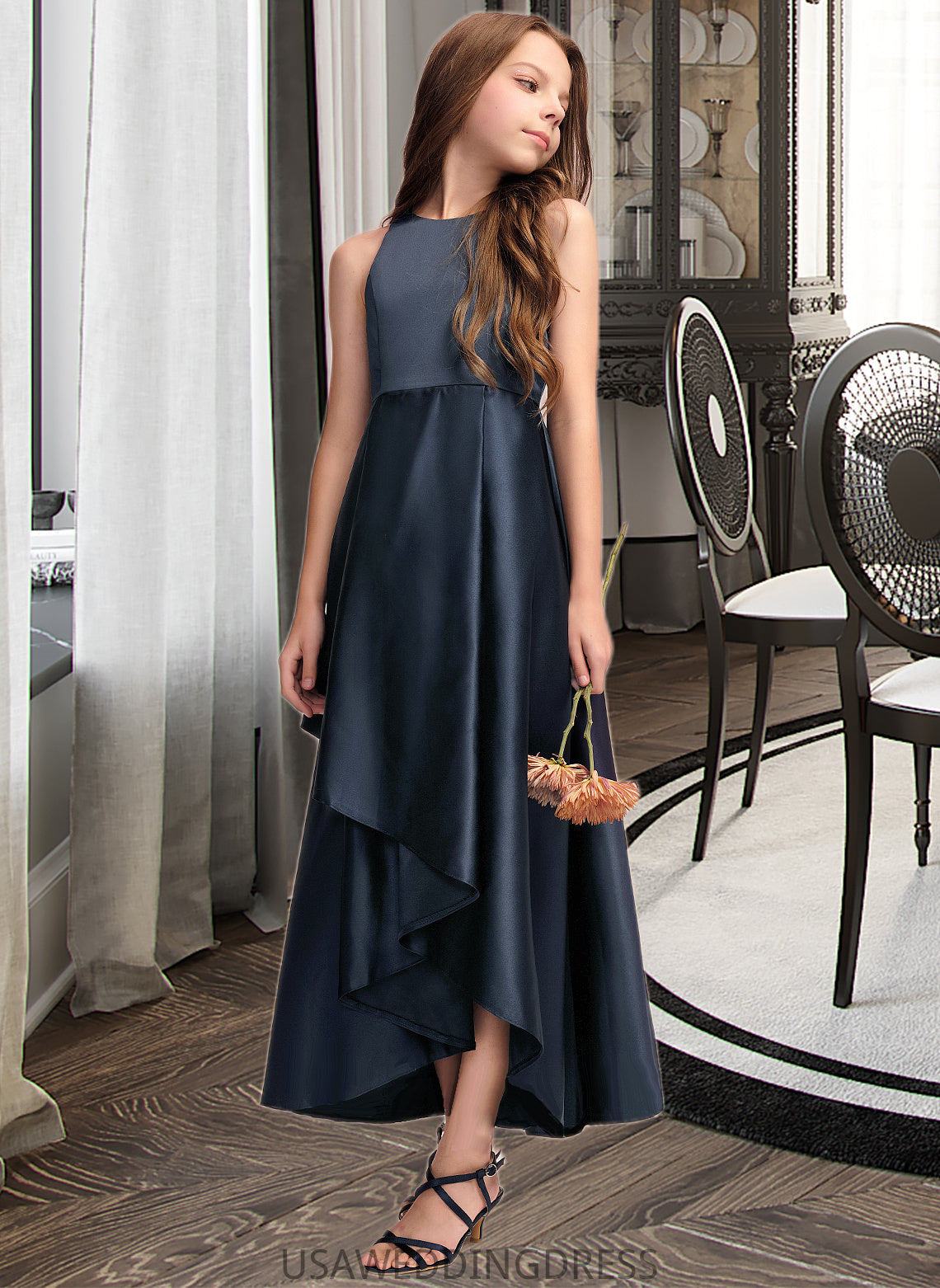 Leia A-Line Scoop Neck Asymmetrical Satin Junior Bridesmaid Dress With Cascading Ruffles DSP0013352
