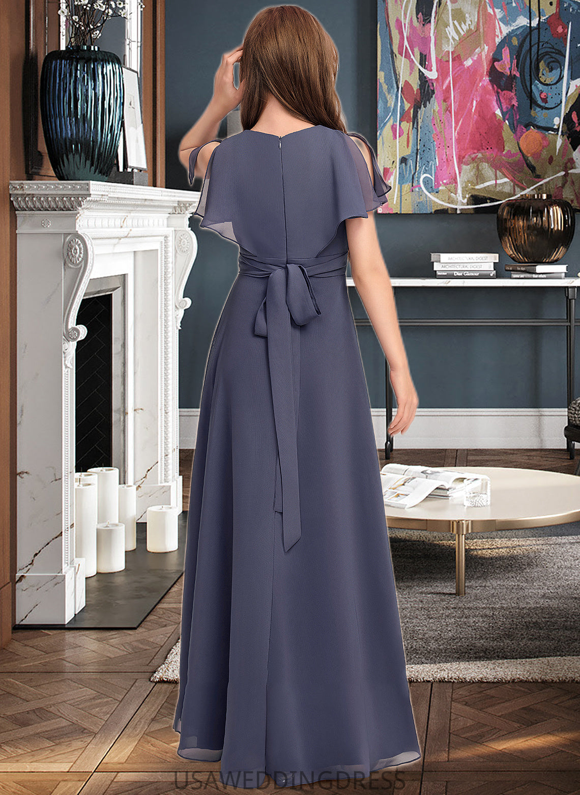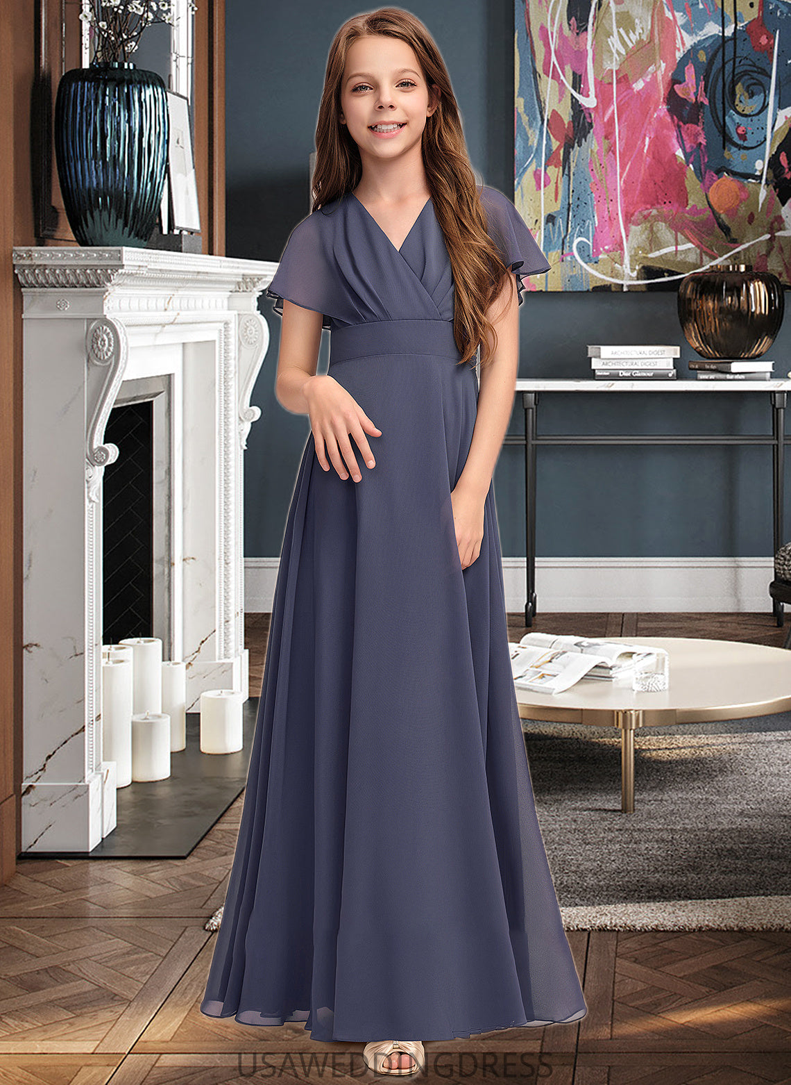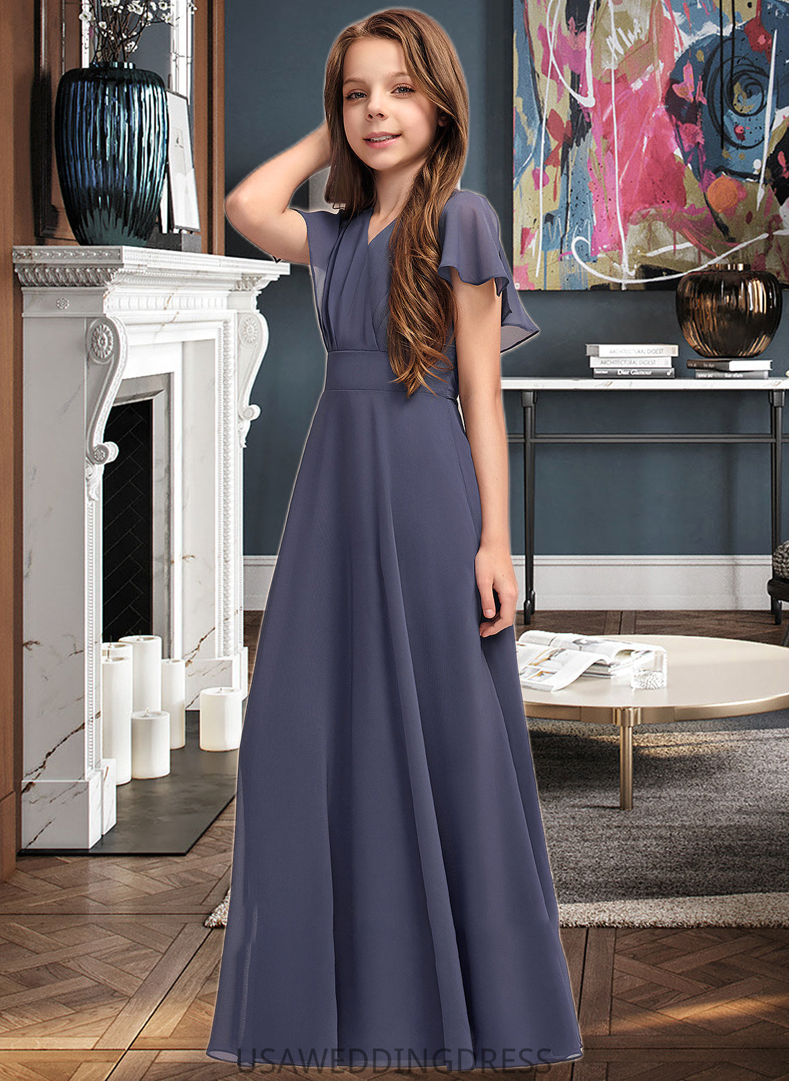 Leia A-Line V-neck Floor-Length Chiffon Junior Bridesmaid Dress With Ruffle Bow(s) DSP0013369