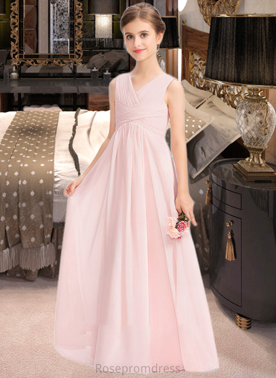 Leila A-Line V-neck Floor-Length Chiffon Junior Bridesmaid Dress With Ruffle SRSP0013328
