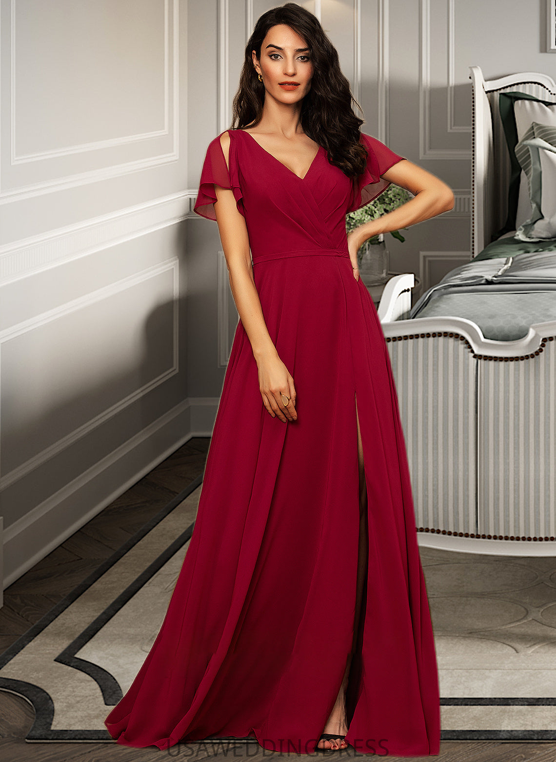 Lesley A-line V-Neck Floor-Length Chiffon Bridesmaid Dress DSP0012858