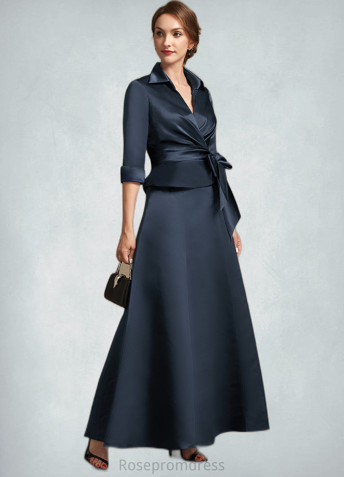 Lilian A-Line V-neck Ankle-Length Satin Mother of the Bride Dress With Bow(s) SRS126P0014683