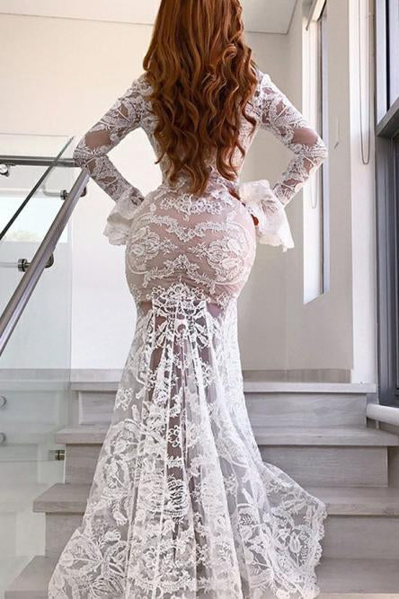 Long Sleeves Mermaid Lace V Neck Wedding Dresses with Slit, Wedding SRS20423