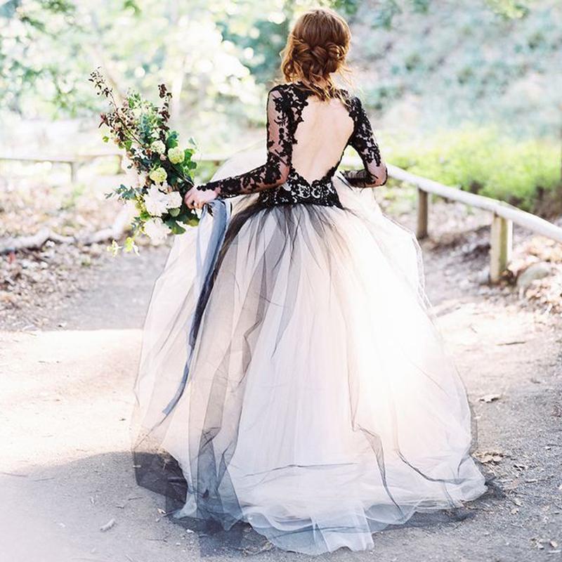 Long Sleeves Wedding Dresses Black Appliques Bridal Dresses Tulle
