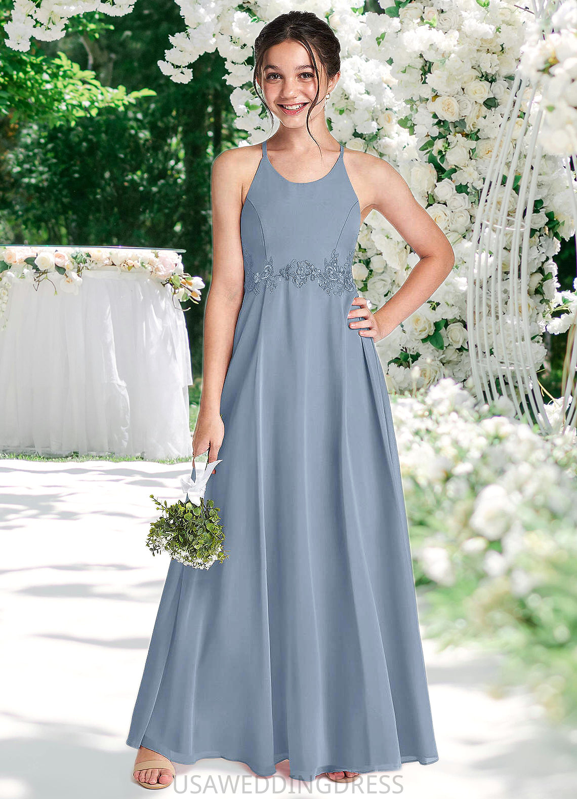 Lorna A-Line Lace Chiffon Floor-Length Junior Bridesmaid Dress dusty blue DSP0022860