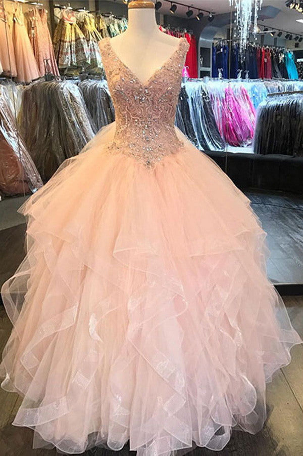 Luxury V-Neck Ruffles Sequin Beads Tulle Floor-Length Wedding Gowns