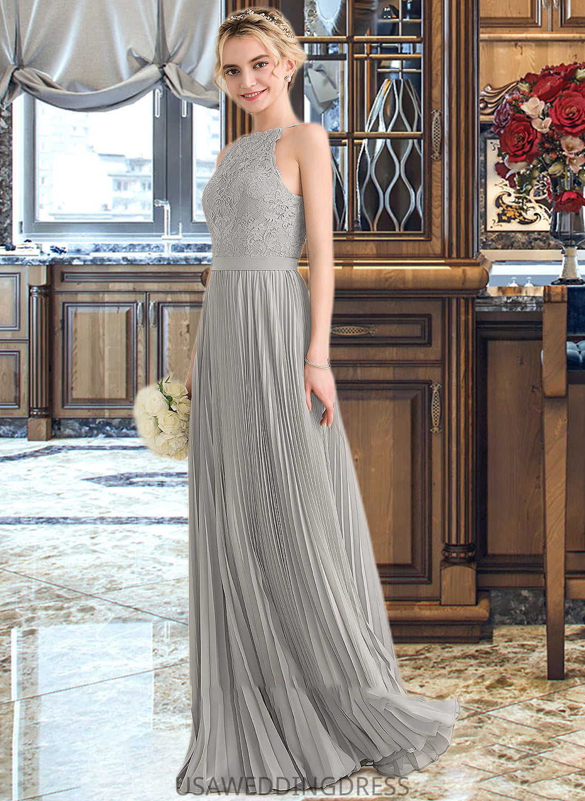Lydia A-Line Scoop Neck Floor-Length Chiffon Lace Bridesmaid Dress With Pleated DSP0012980