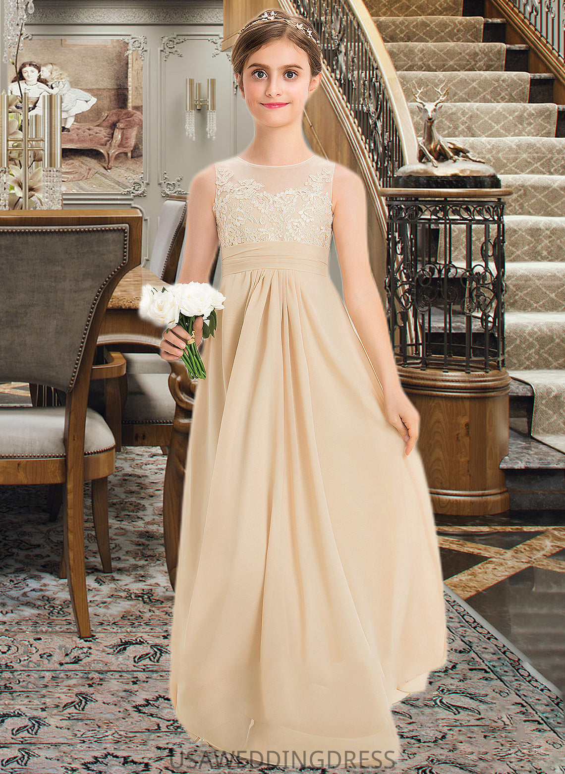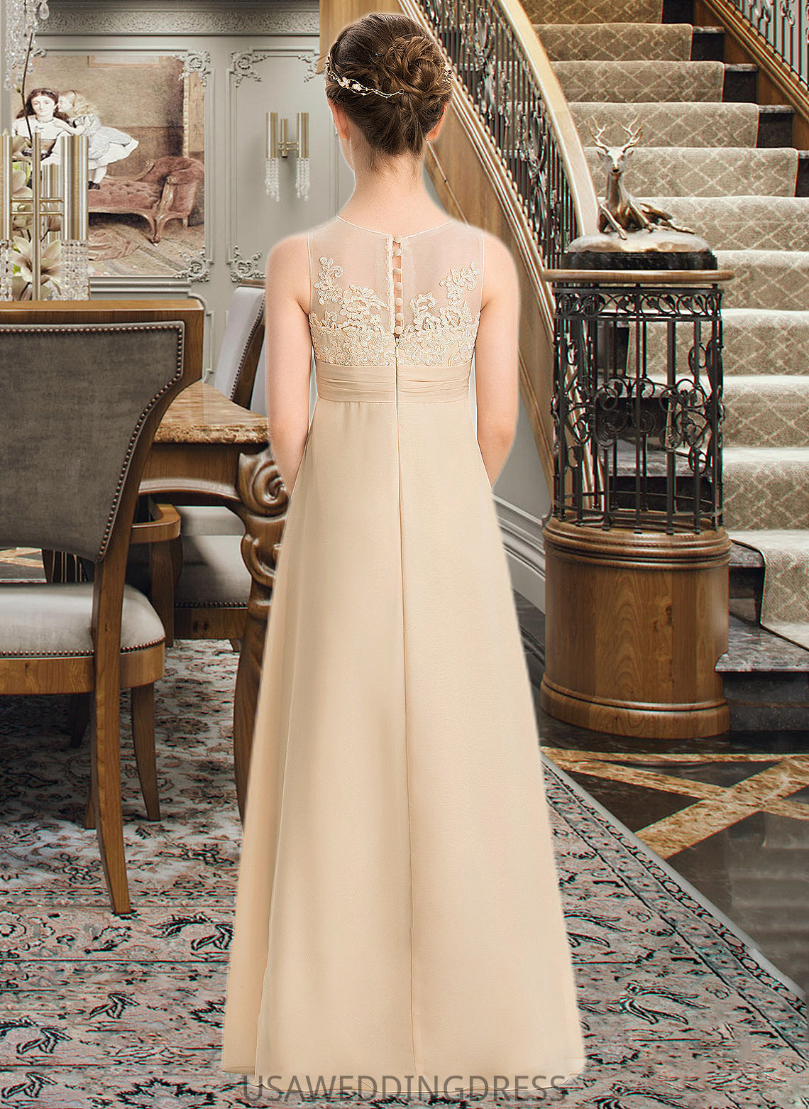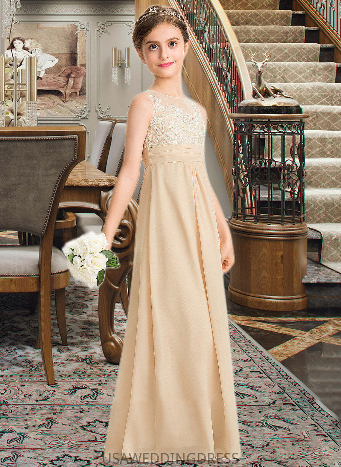 Madelynn A-Line Scoop Neck Floor-Length Chiffon Lace Junior Bridesmaid Dress DSP0013539