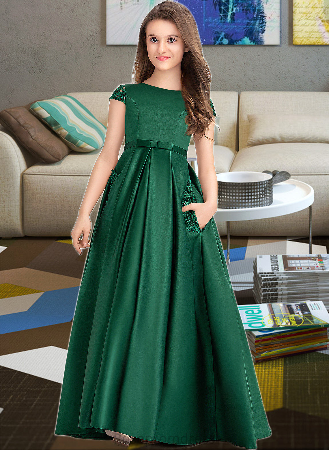 Martha Ball-Gown/Princess Scoop Neck Floor-Length Satin Lace Junior Bridesmaid Dress With Bow(s) Pockets SRSP0013311