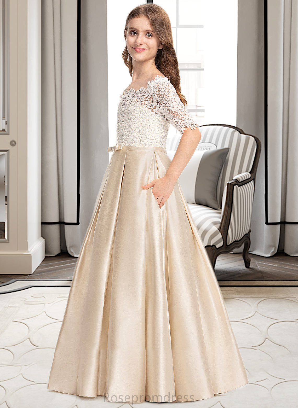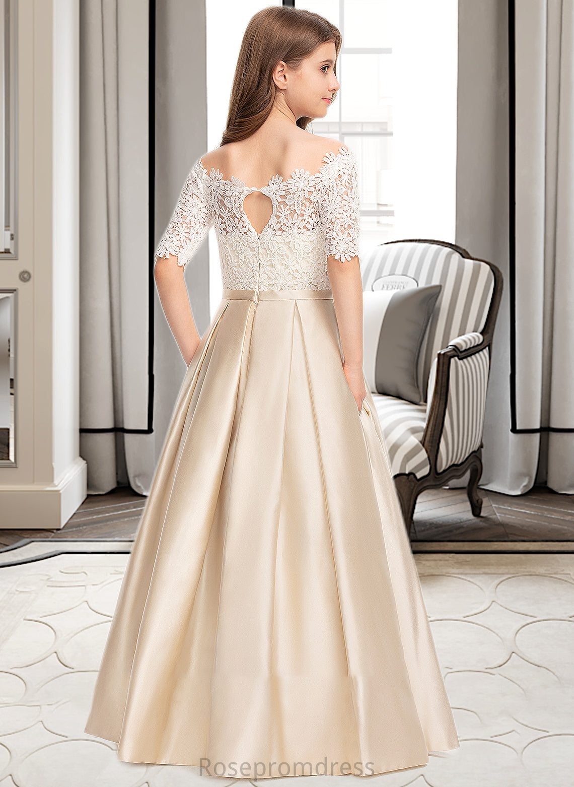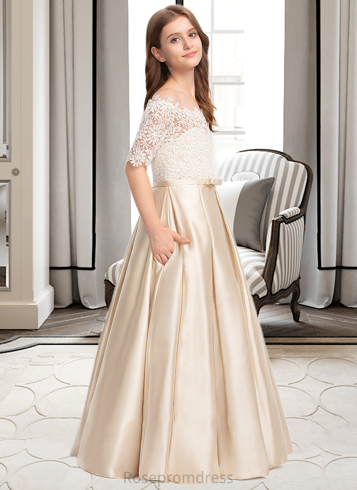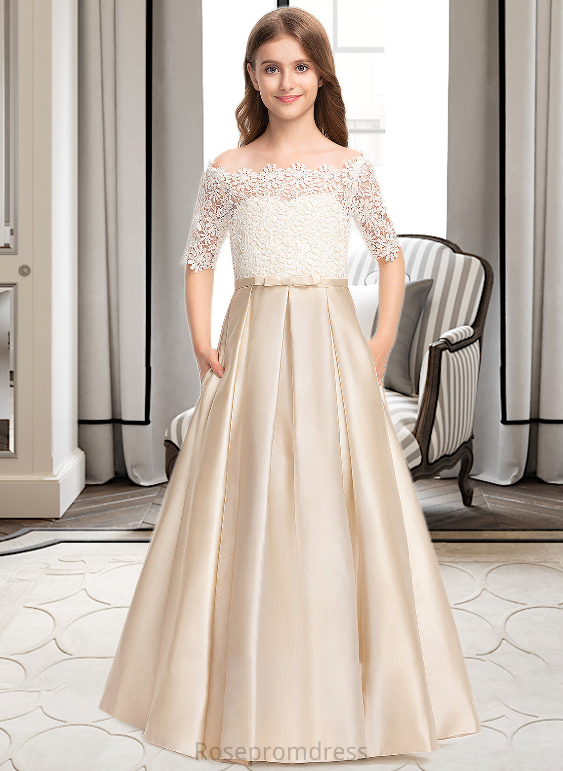 Melanie Ball-Gown/Princess Off-the-Shoulder Floor-Length Satin Lace Junior Bridesmaid Dress With Bow(s) Pockets SRSP0013530
