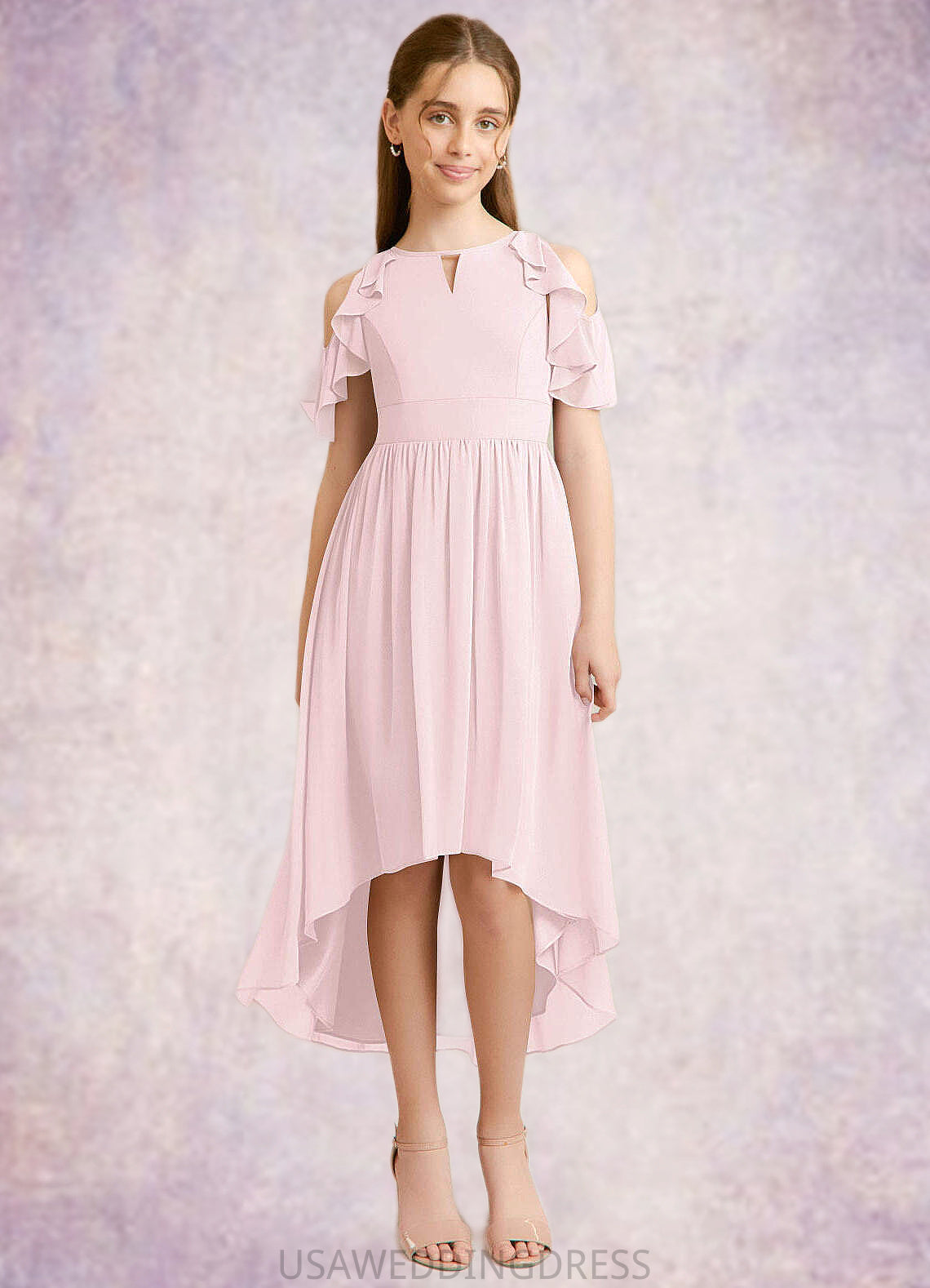 Melina A-Line Ruched Chiffon Asymmetrical Junior Bridesmaid Dress Blushing Pink DSP0022862