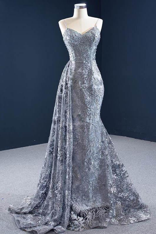 Mermaid Lace Grey Sleeveless Spaghetti Straps Long Formal Evening Dress