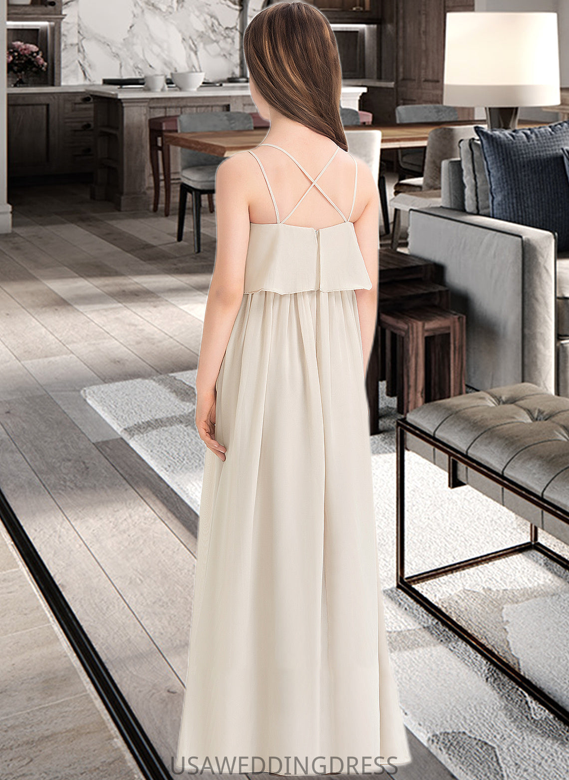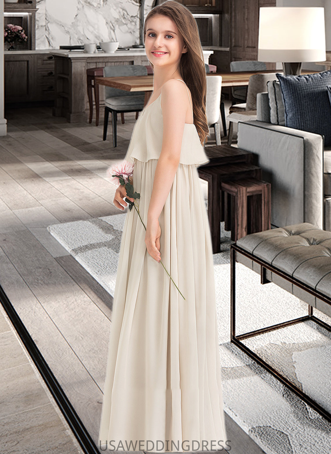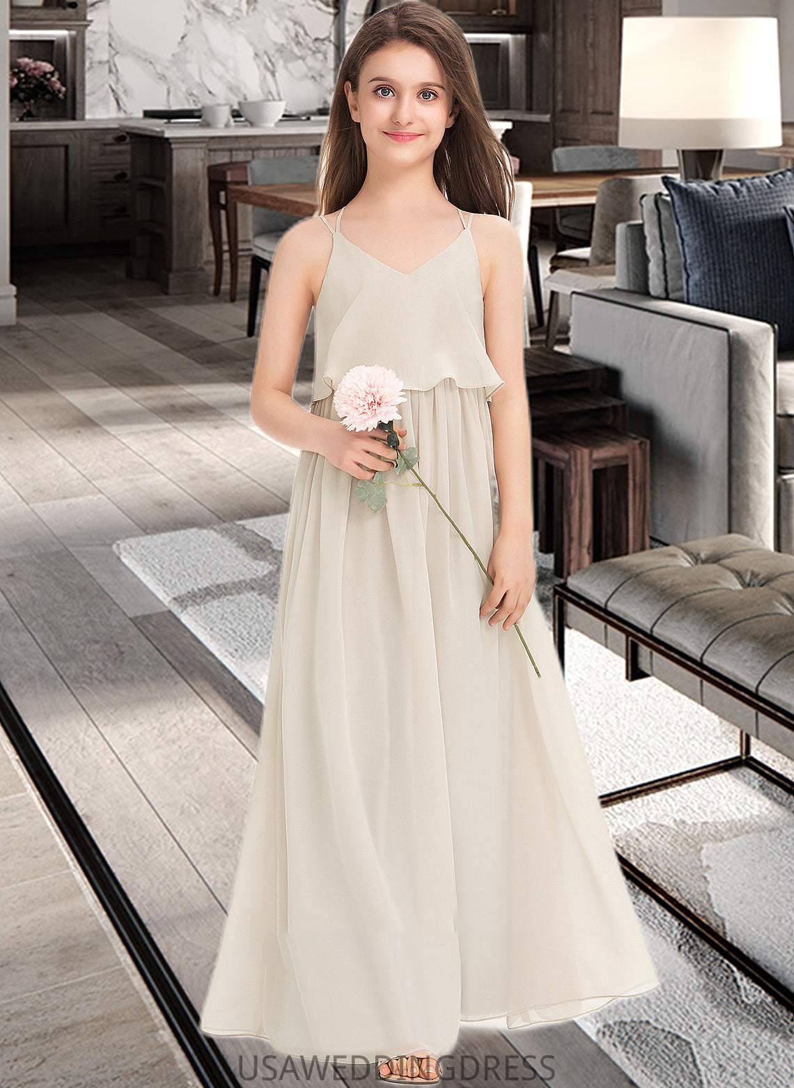 Micah A-Line V-neck Floor-Length Chiffon Junior Bridesmaid Dress DSP0013435