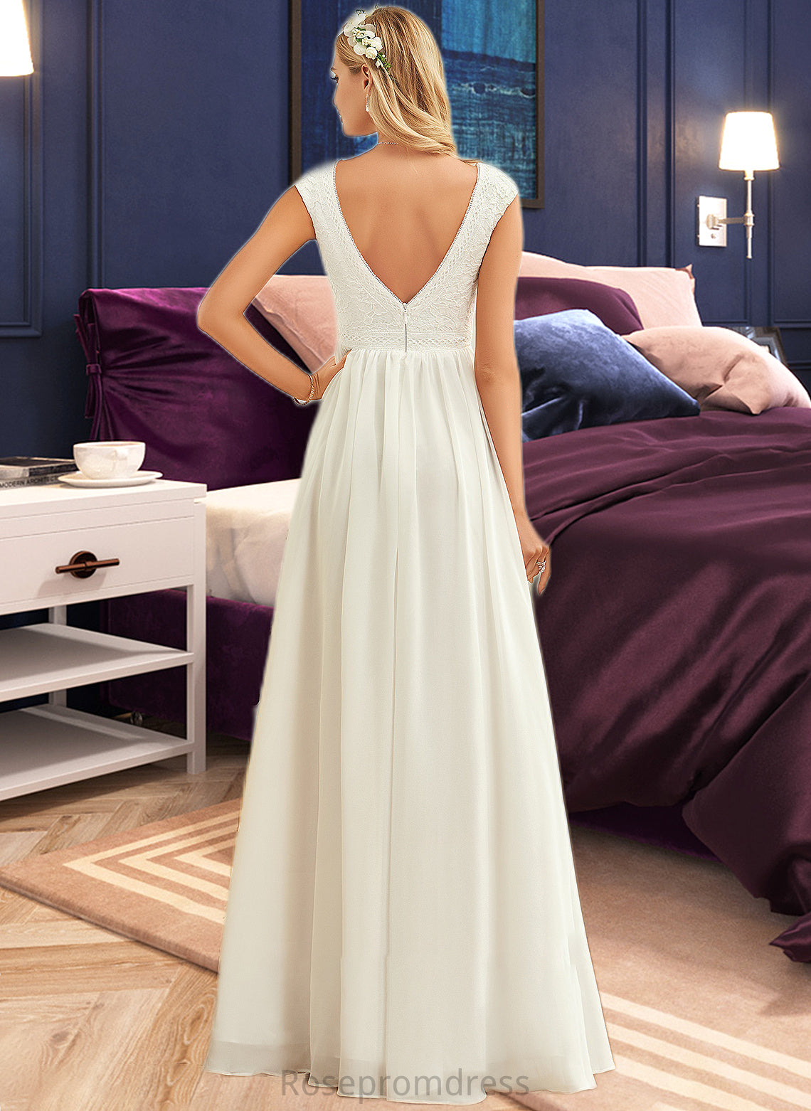 Mildred A-Line V-neck Floor-Length Chiffon Lace Wedding Dress SRSP0013722