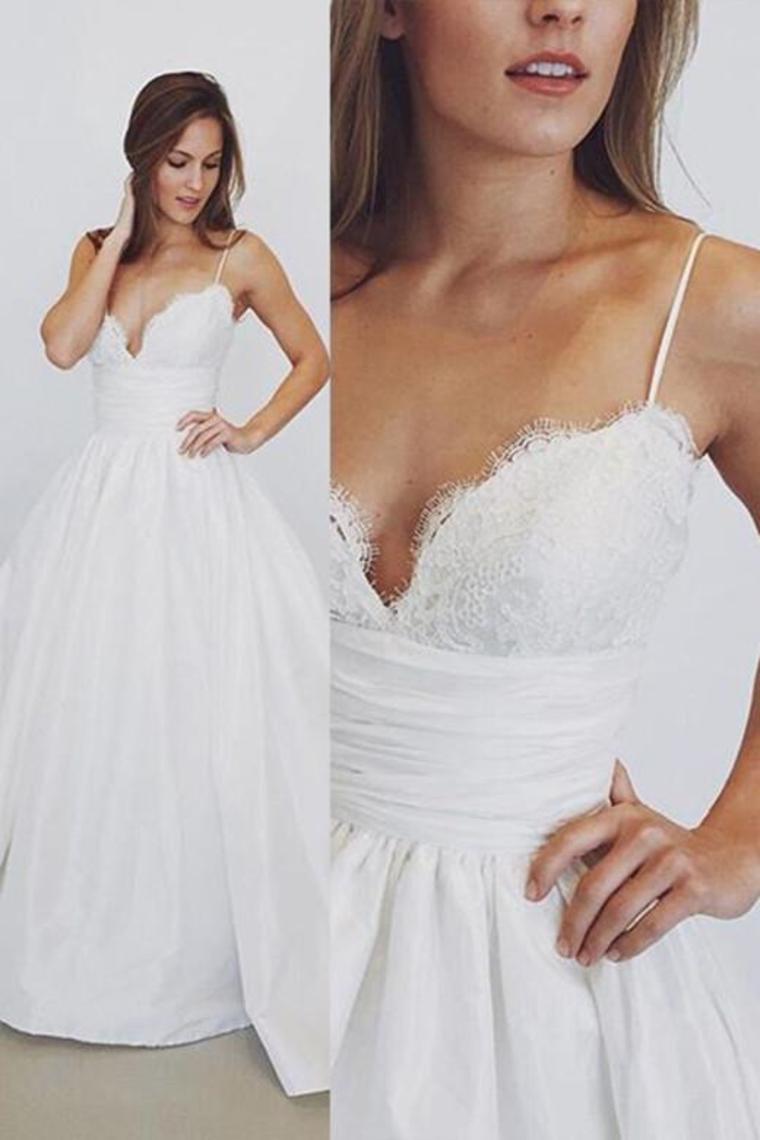 Modest Ivory Lace Satin Long Spaghetti Straps Simple Elegant Wedding Dresses