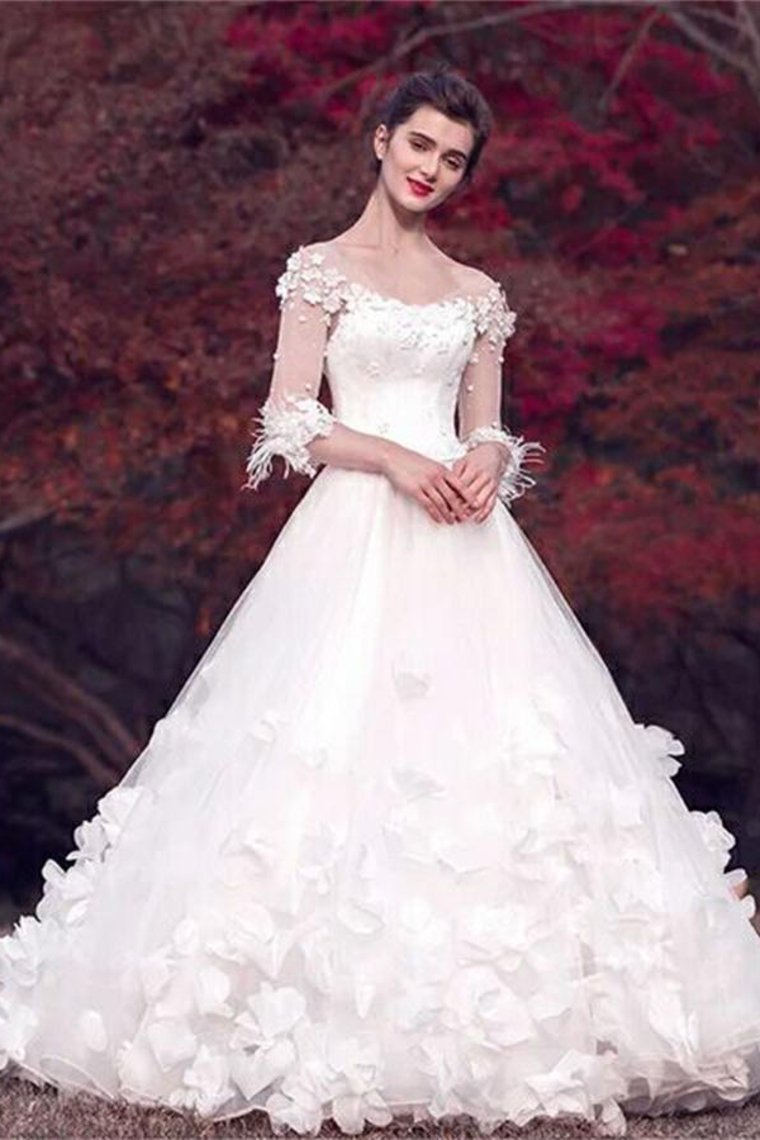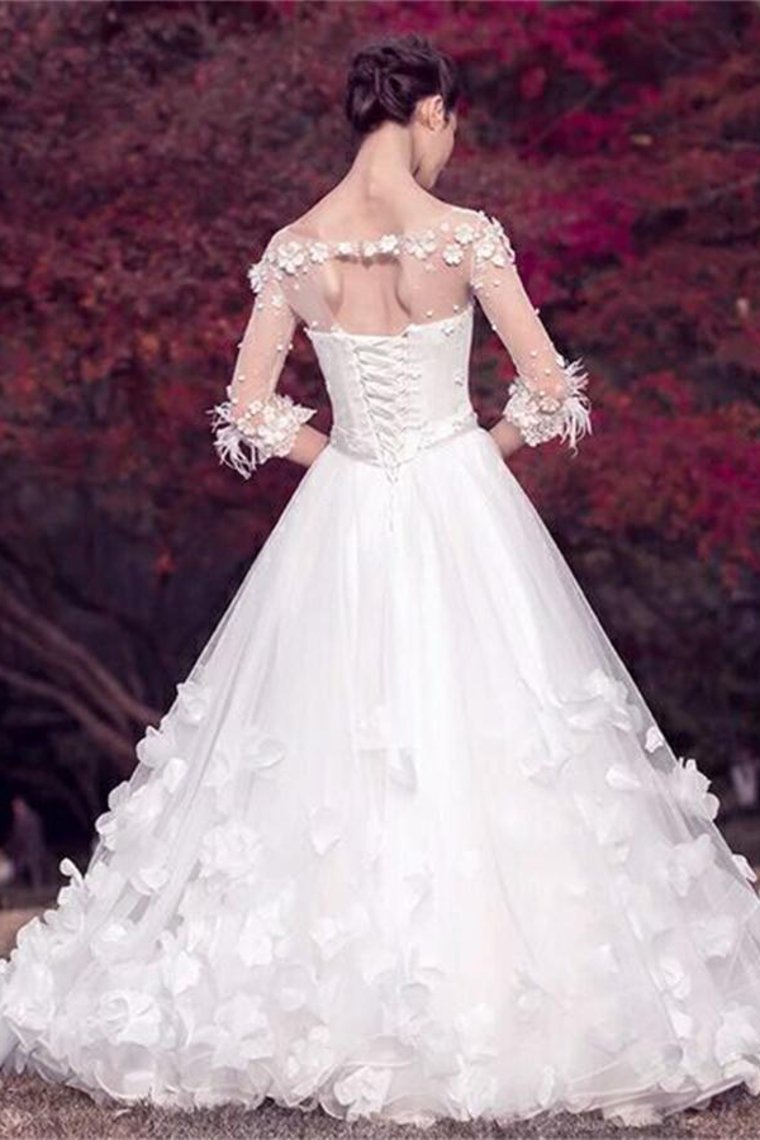 Modest Long Floor Length White Lace Ball Gown Lace Wedding Dresses Bridal Dresses
