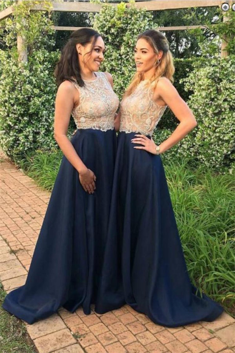 Modest Navy Long A-Line Beading A-Line Prom Dresses Bridesmaid Dresses
