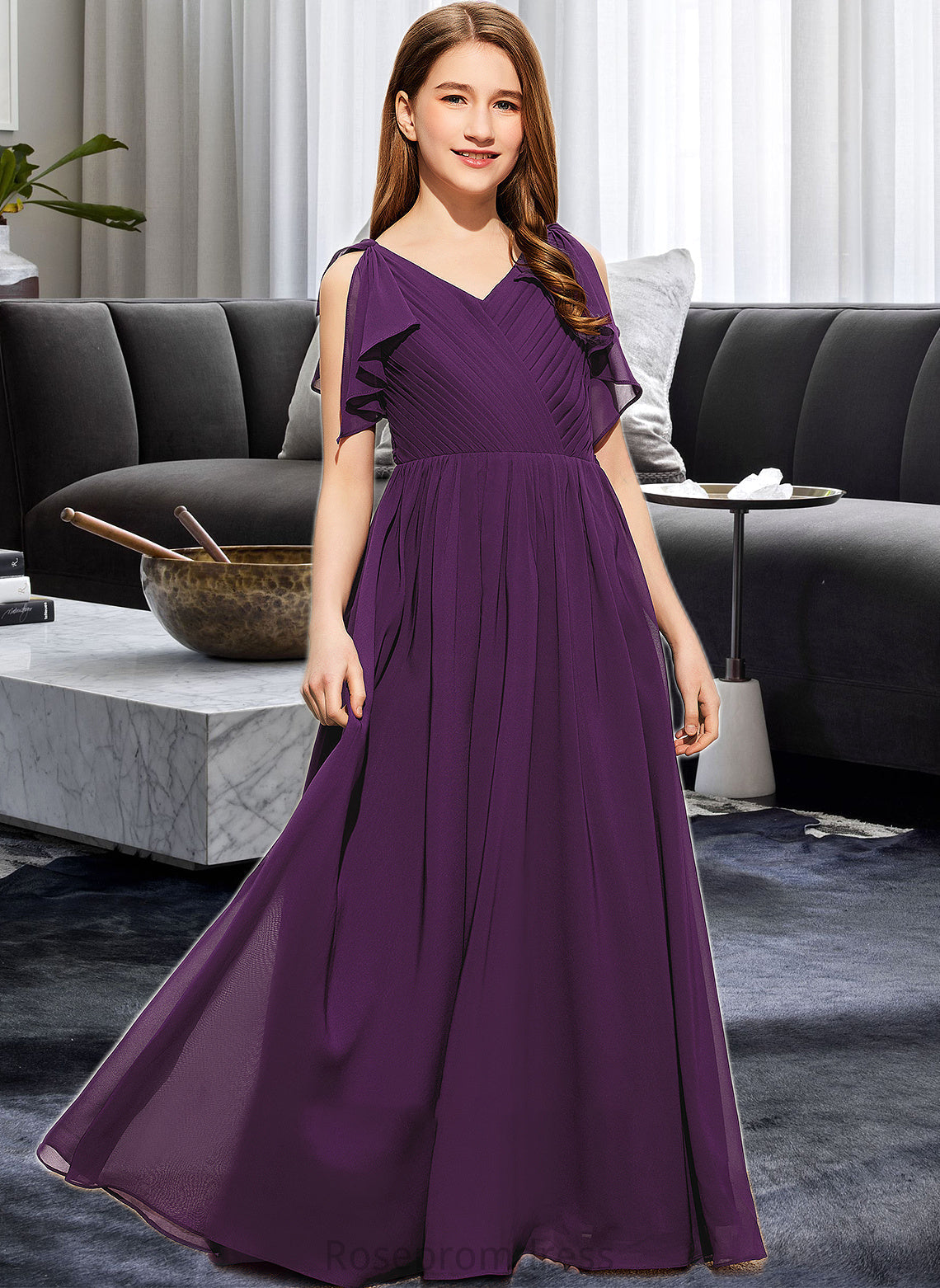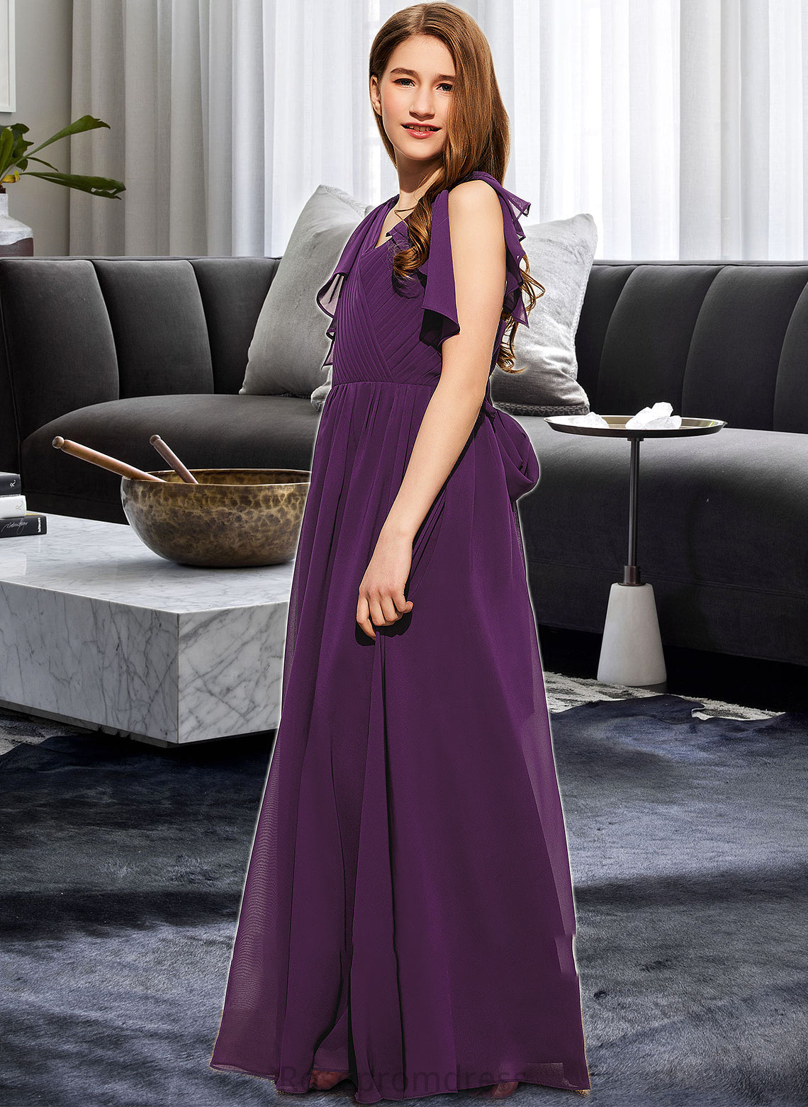Mollie A-Line V-neck Floor-Length Chiffon Junior Bridesmaid Dress With Bow(s) Cascading Ruffles SRSP0013639