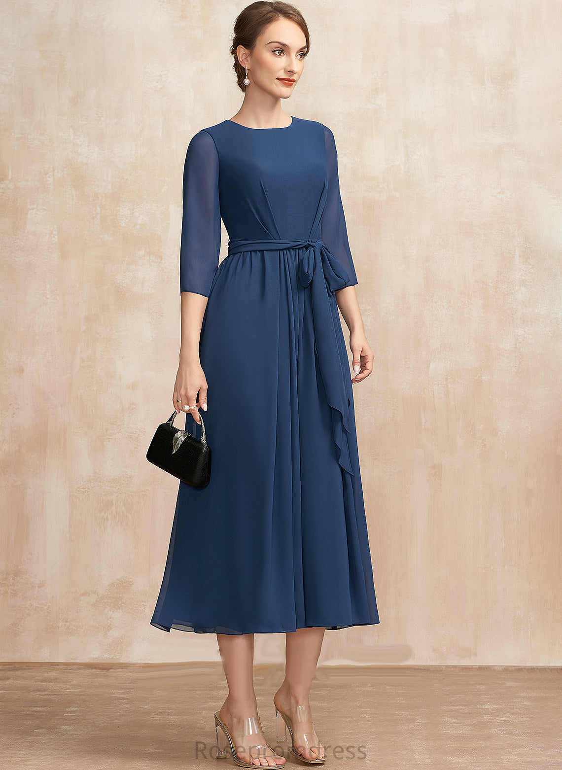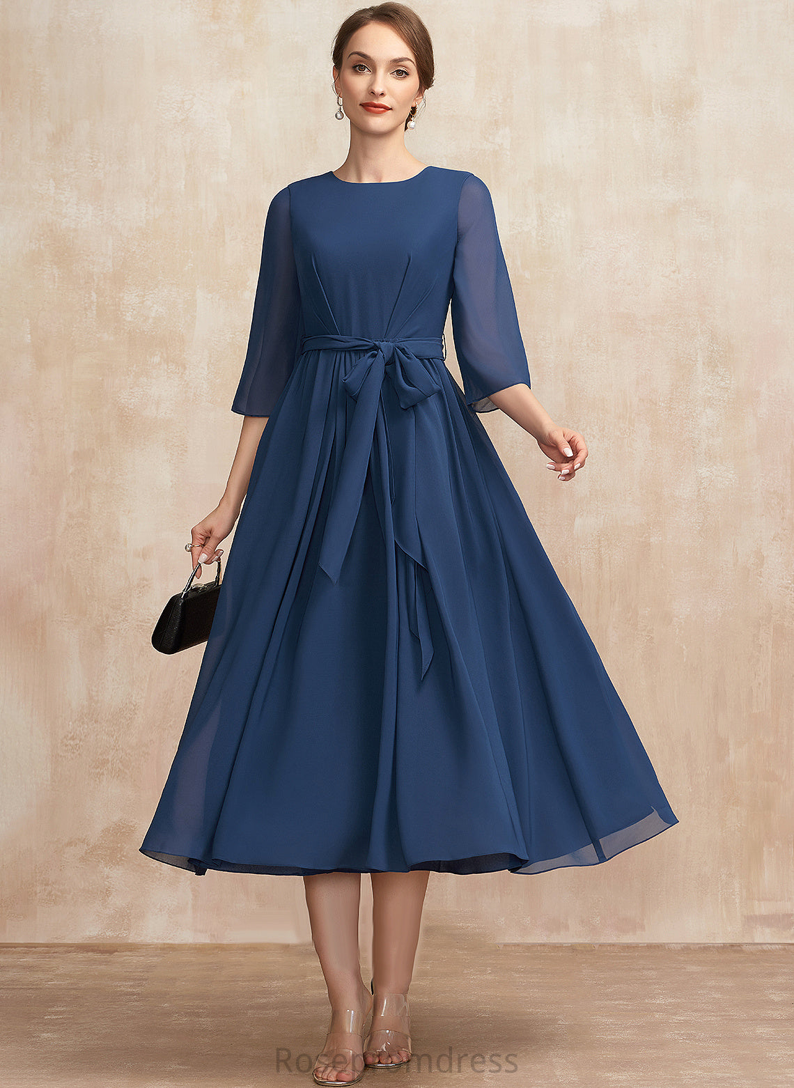 Mother of the Bride Dresses of Tea-Length Ruffle the Scoop With Chiffon Neck Bride Bow(s) Dress Mother Kaitlyn A-Line