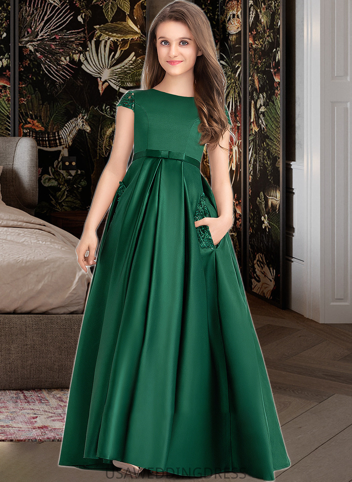 Nathalia Ball-Gown/Princess Scoop Neck Floor-Length Satin Lace Junior Bridesmaid Dress With Bow(s) Pockets DSP0013311