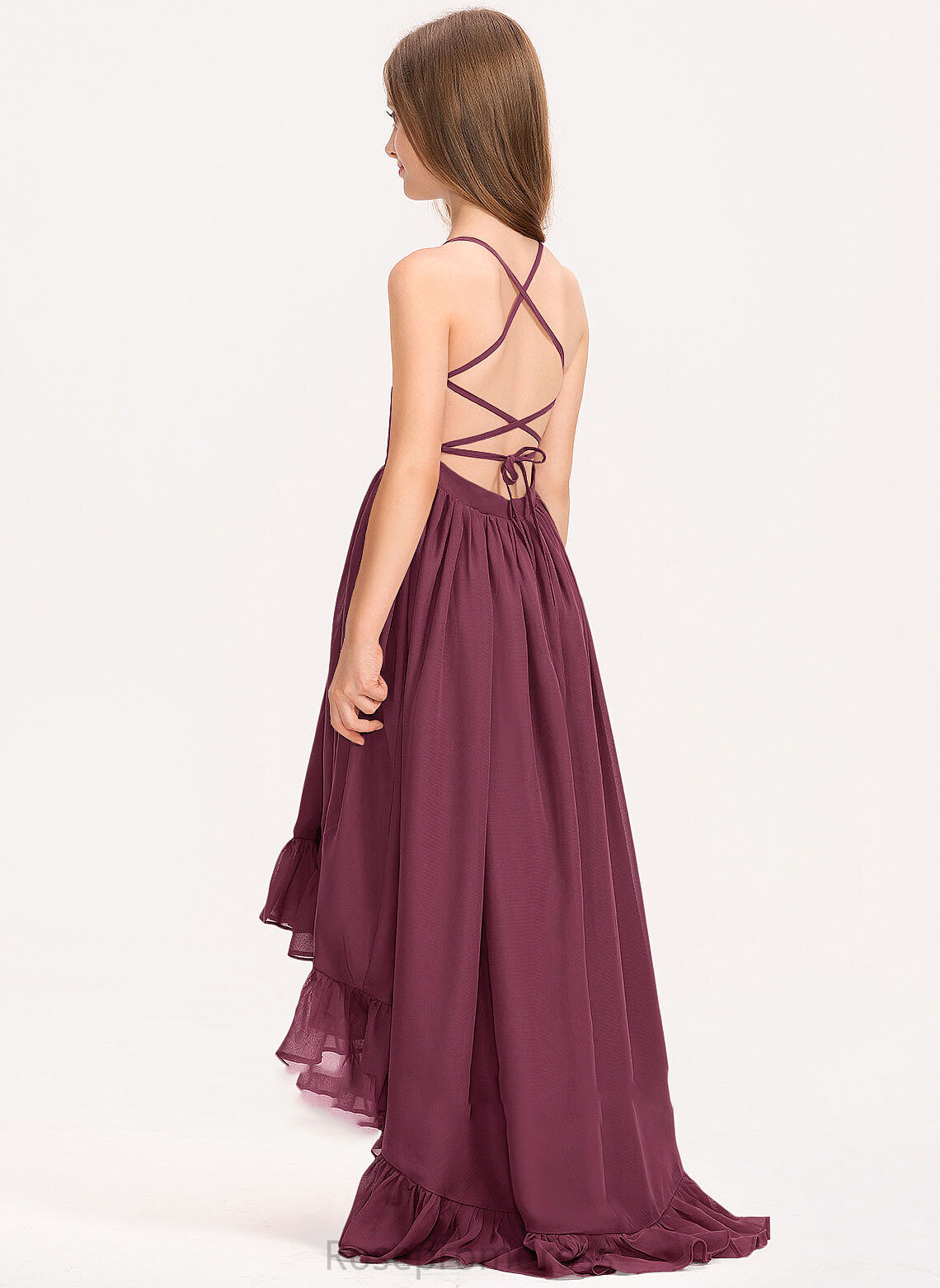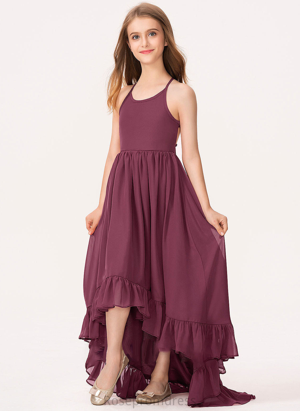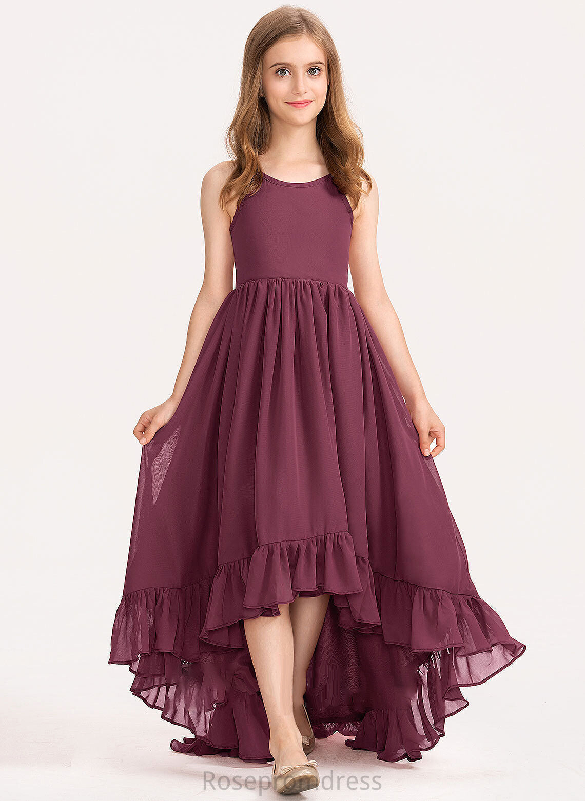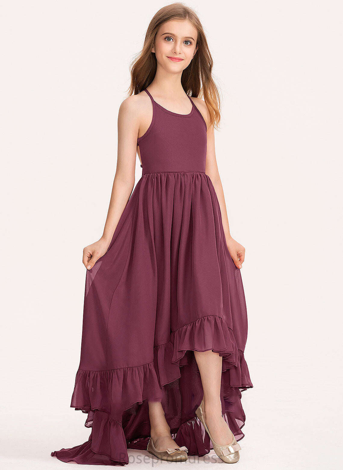 Neck Bow(s) Ruffles Asymmetrical With Marely Junior Bridesmaid Dresses Scoop Cascading Chiffon A-Line