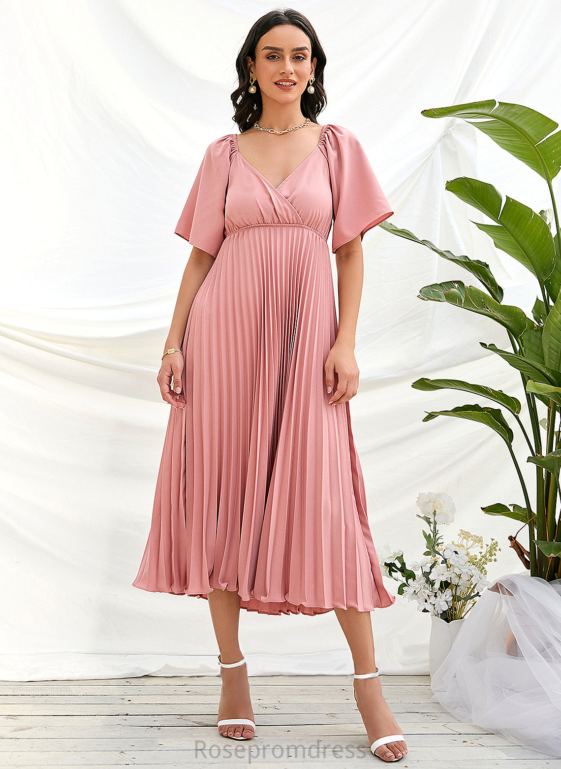 Neckline Fabric Length Pleated Silhouette Tea-Length A-Line V-neck Embellishment Jamiya A-Line/Princess Natural Waist Bridesmaid Dresses
