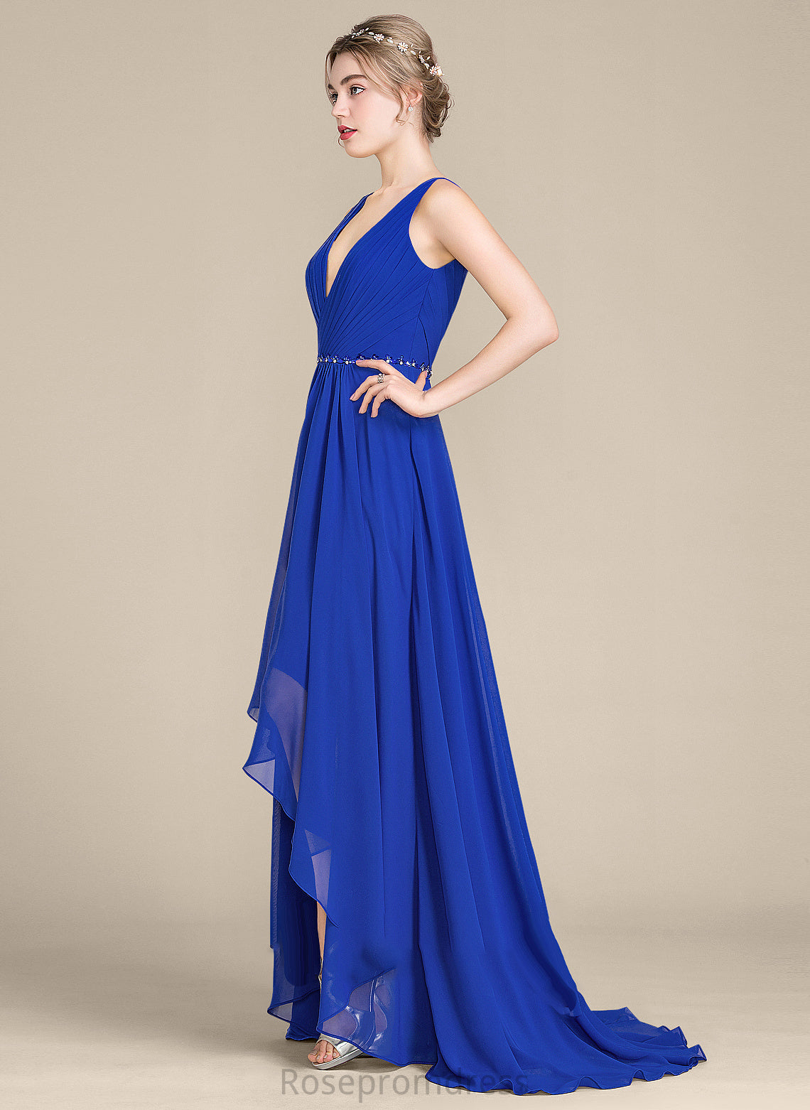 Neckline Length Fabric Sequins Embellishment Silhouette Beading A-Line V-neck Asymmetrical Ruffle Aniya Bridesmaid Dresses