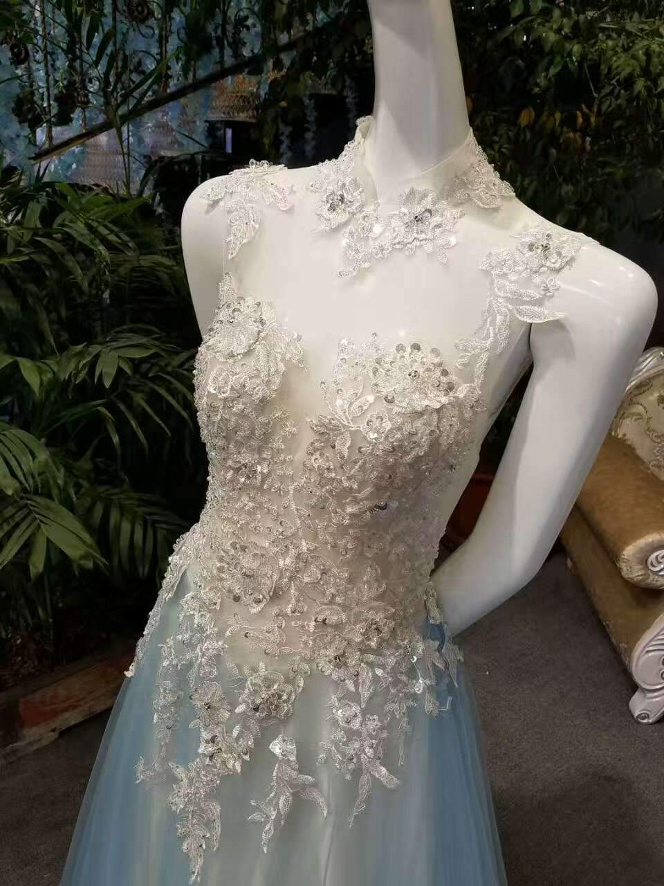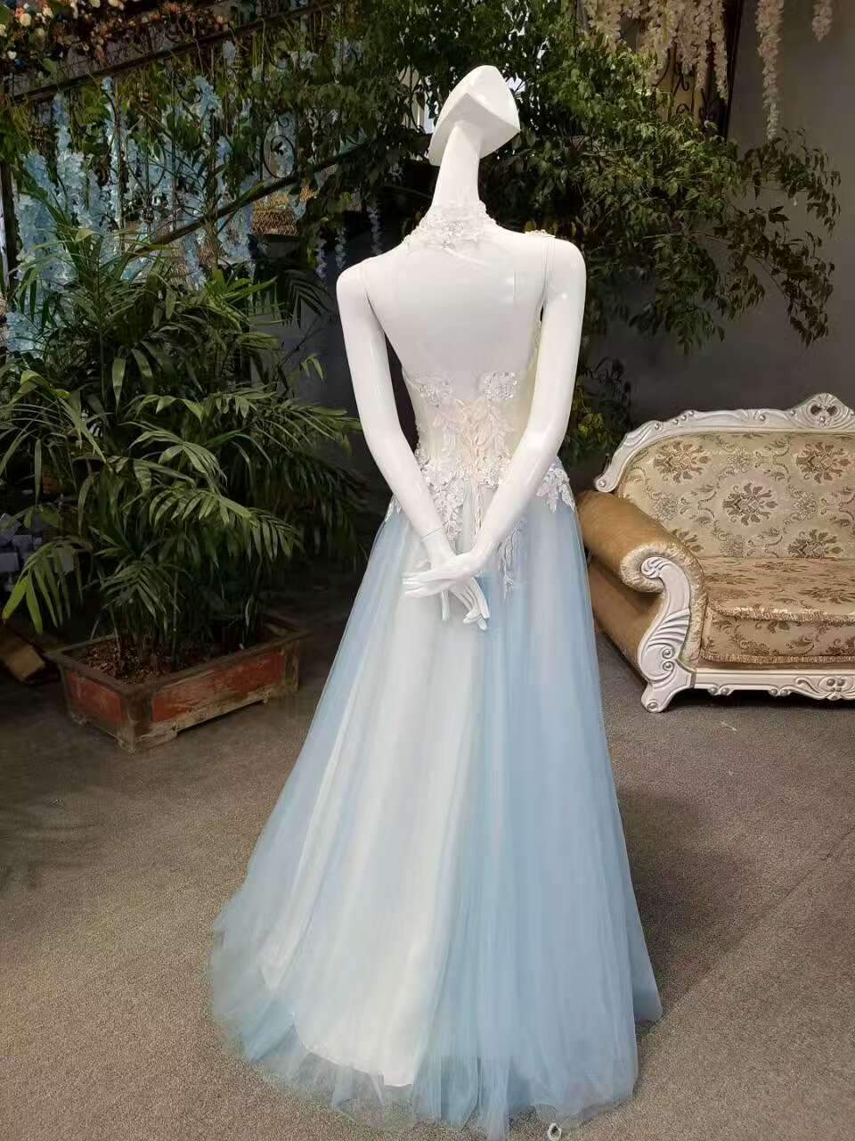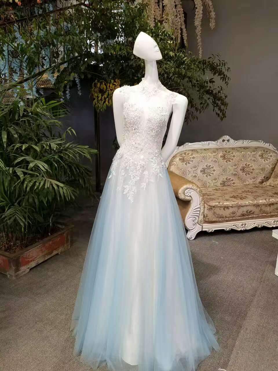 New Arrival A-Line High Neck Tulle Prom Dresses Floor Length Lace SRS12950