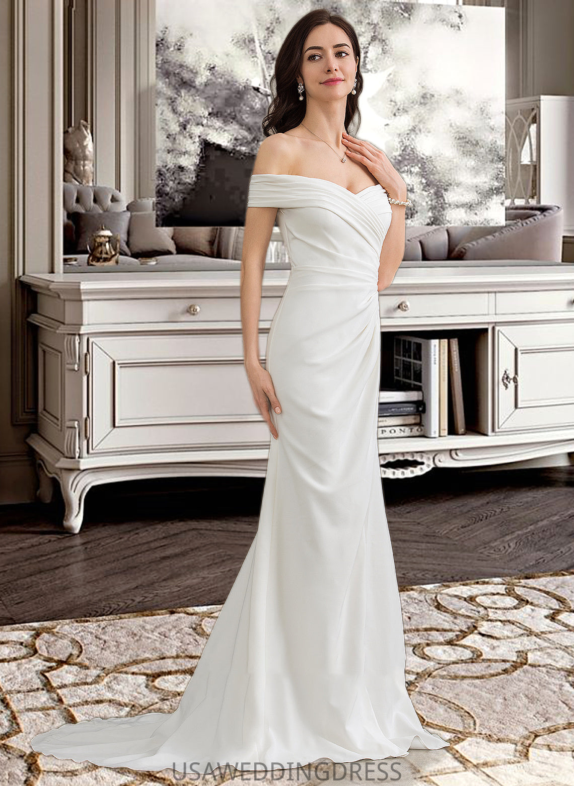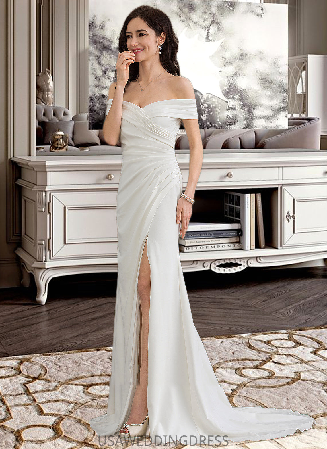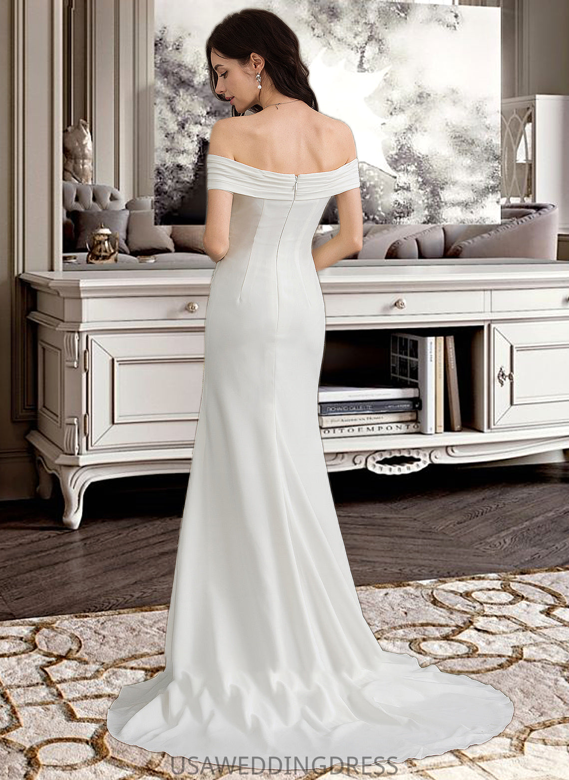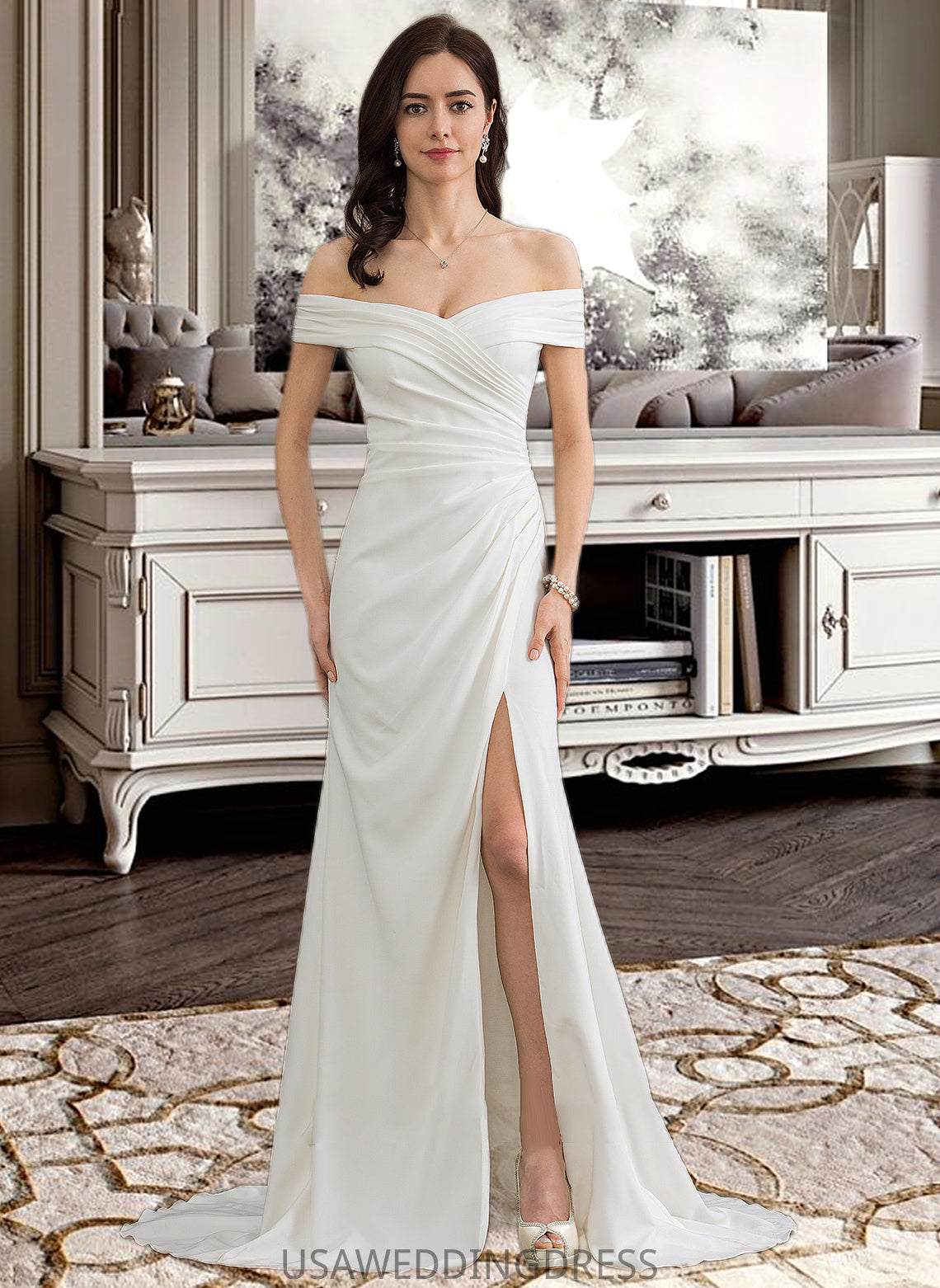 Nicky Sheath/Column Off-the-Shoulder Sweep Train Stretch Crepe Wedding Dress With Ruffle Split Front DSP0013707