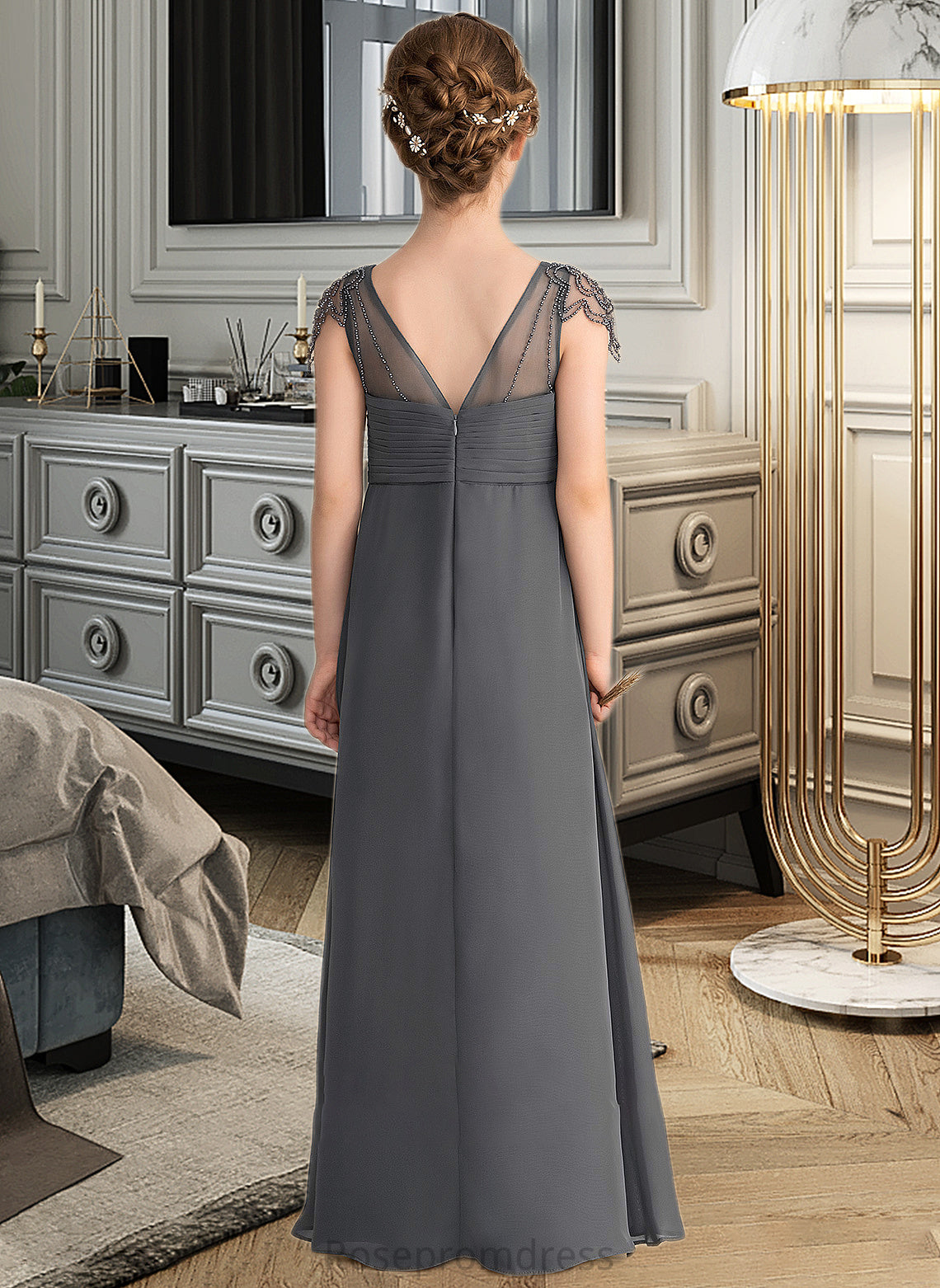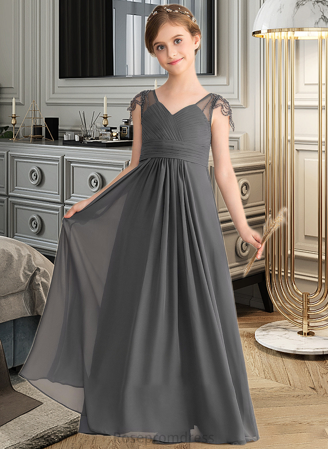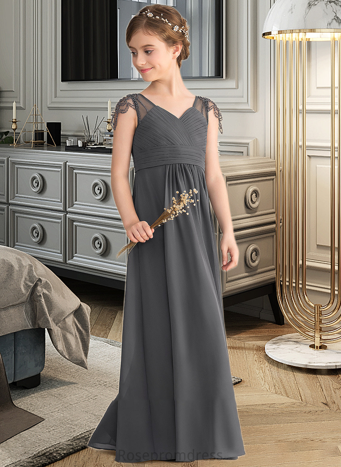 Nicola A-Line V-neck Floor-Length Chiffon Junior Bridesmaid Dress With Ruffle Beading SRSP0013653