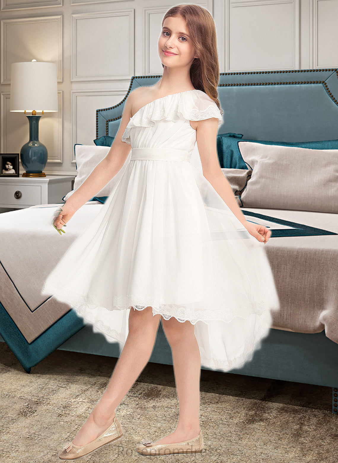 Nina A-Line One-Shoulder Asymmetrical Chiffon Lace Junior Bridesmaid Dress With Bow(s) SRSP0013557