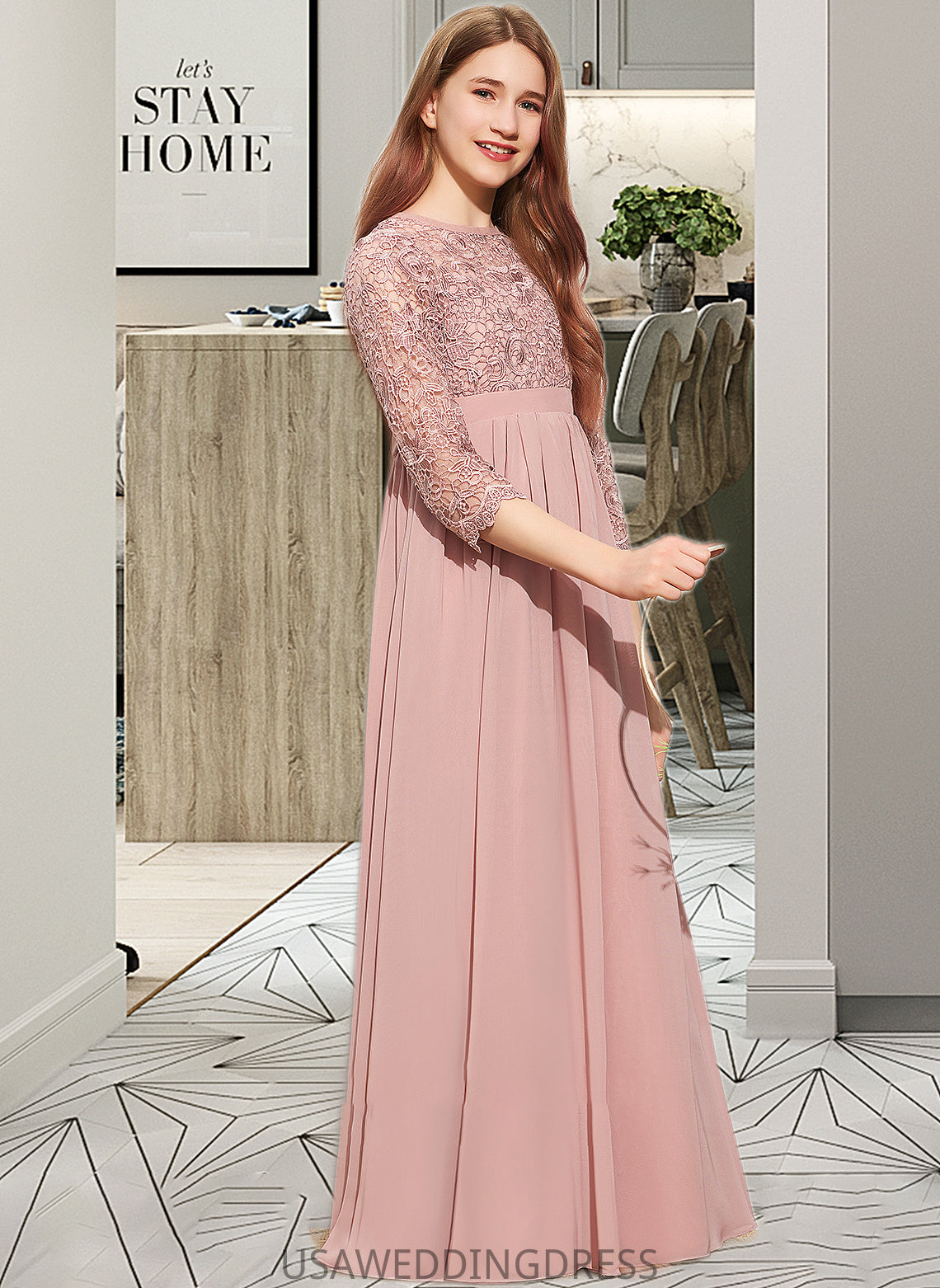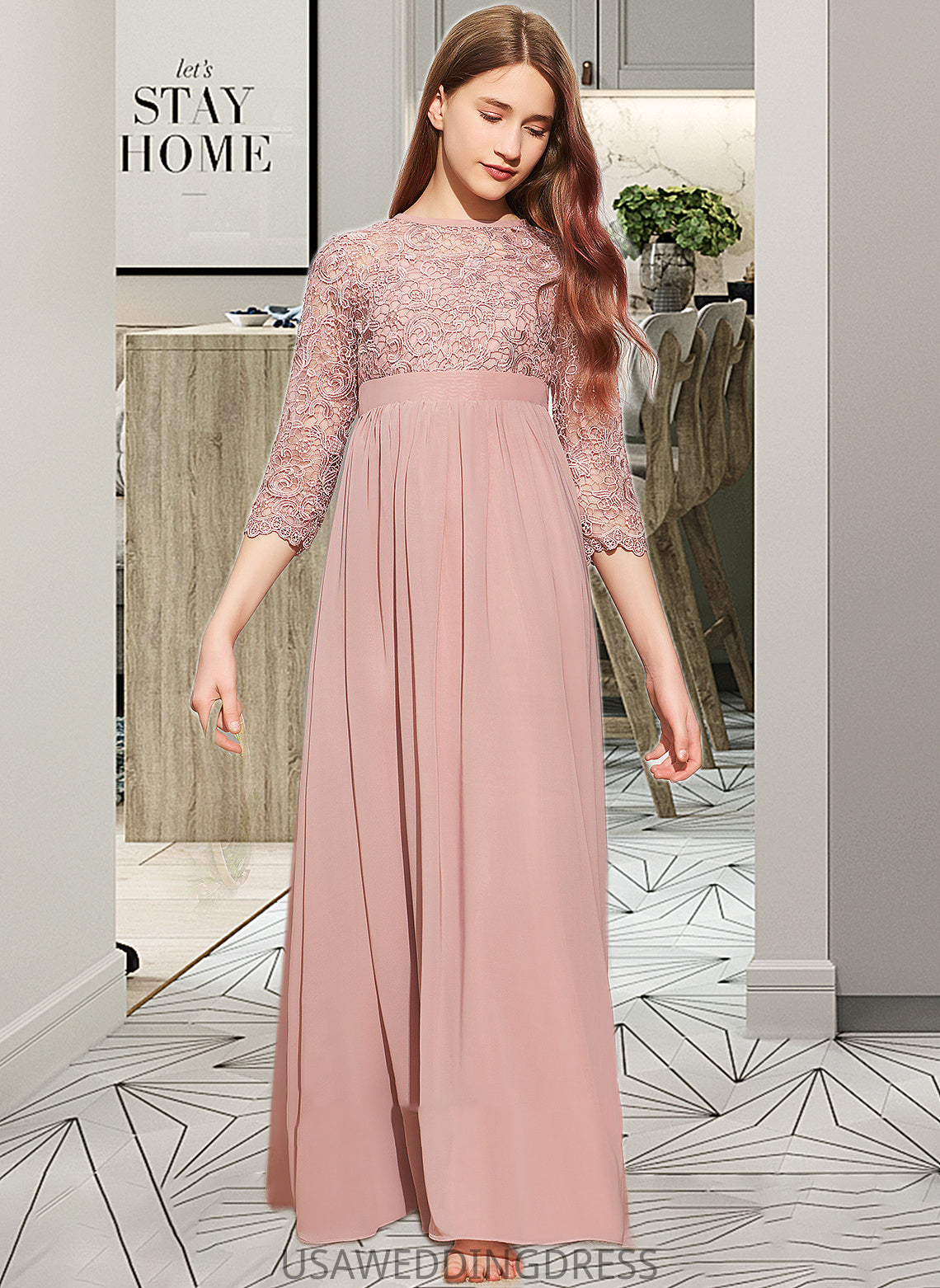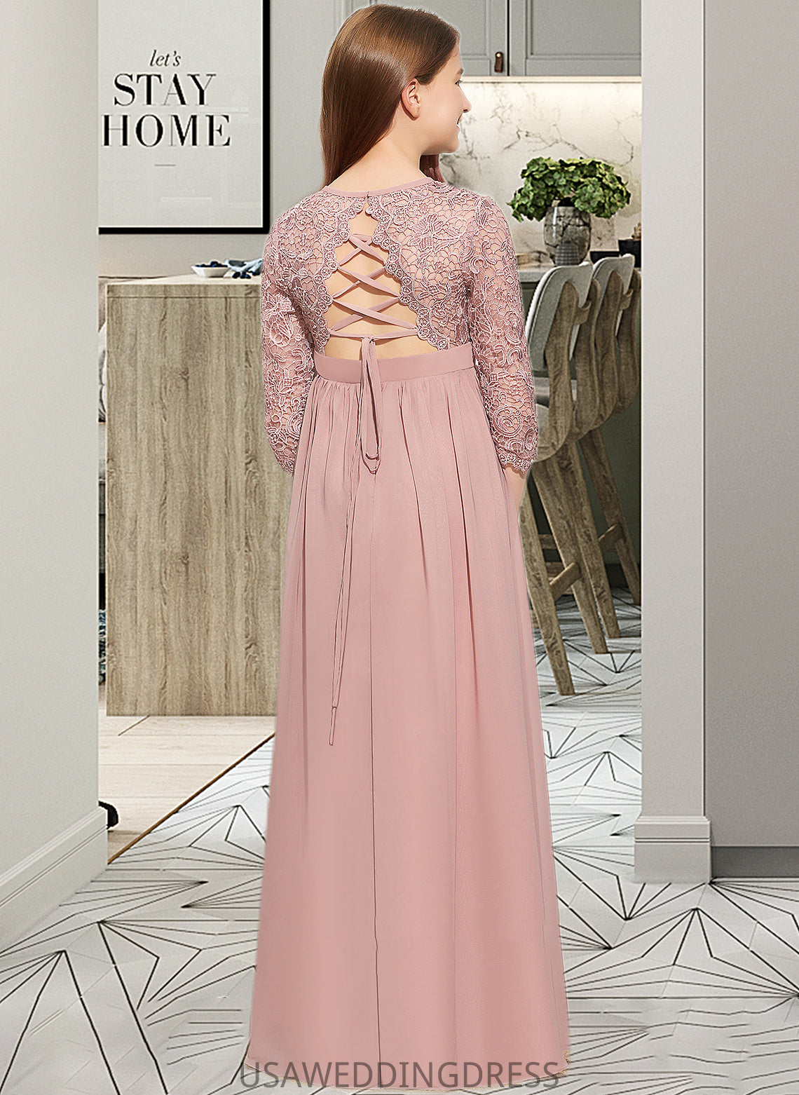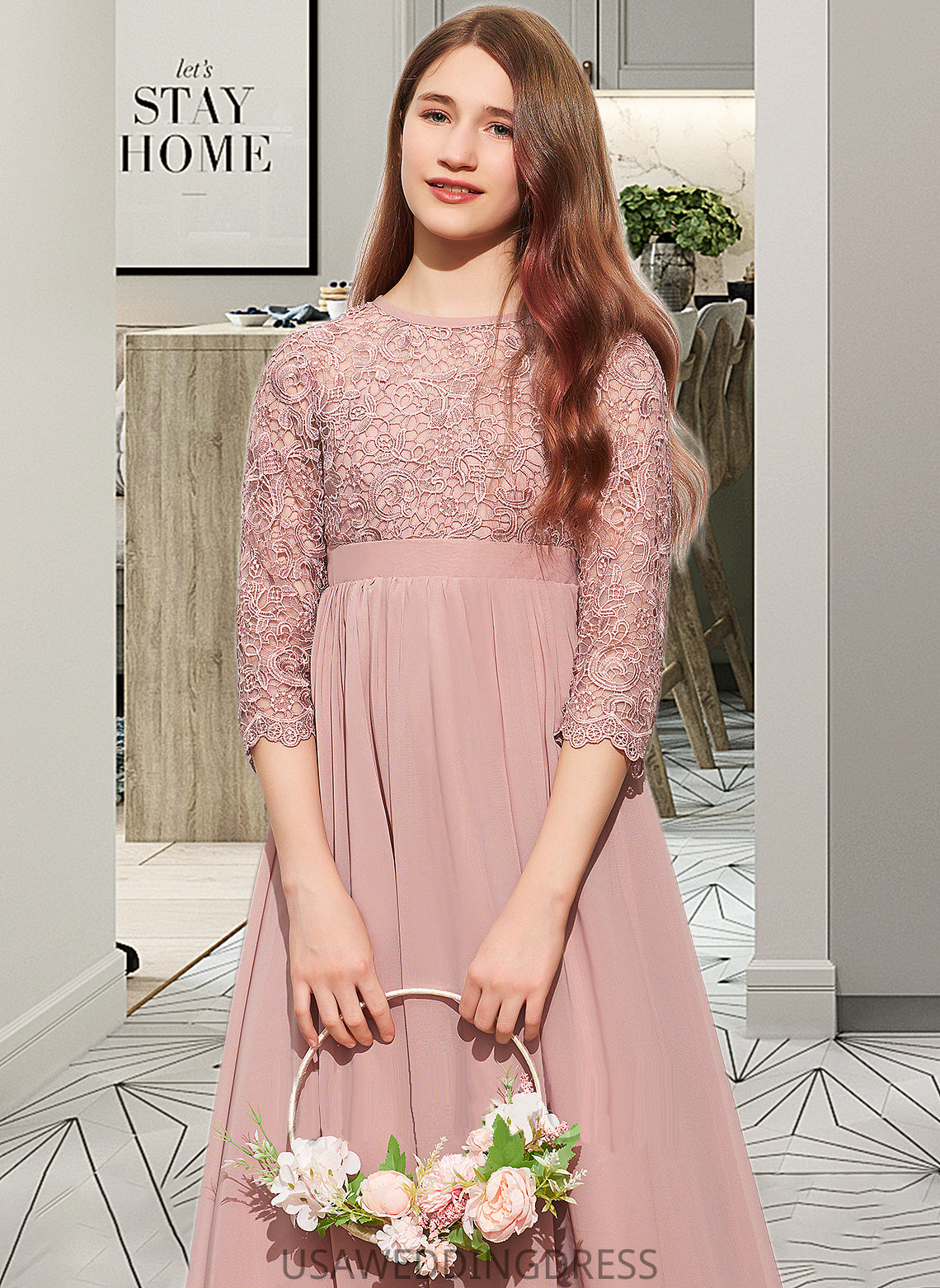Nina A-Line Scoop Neck Floor-Length Chiffon Lace Junior Bridesmaid Dress DSP0013657