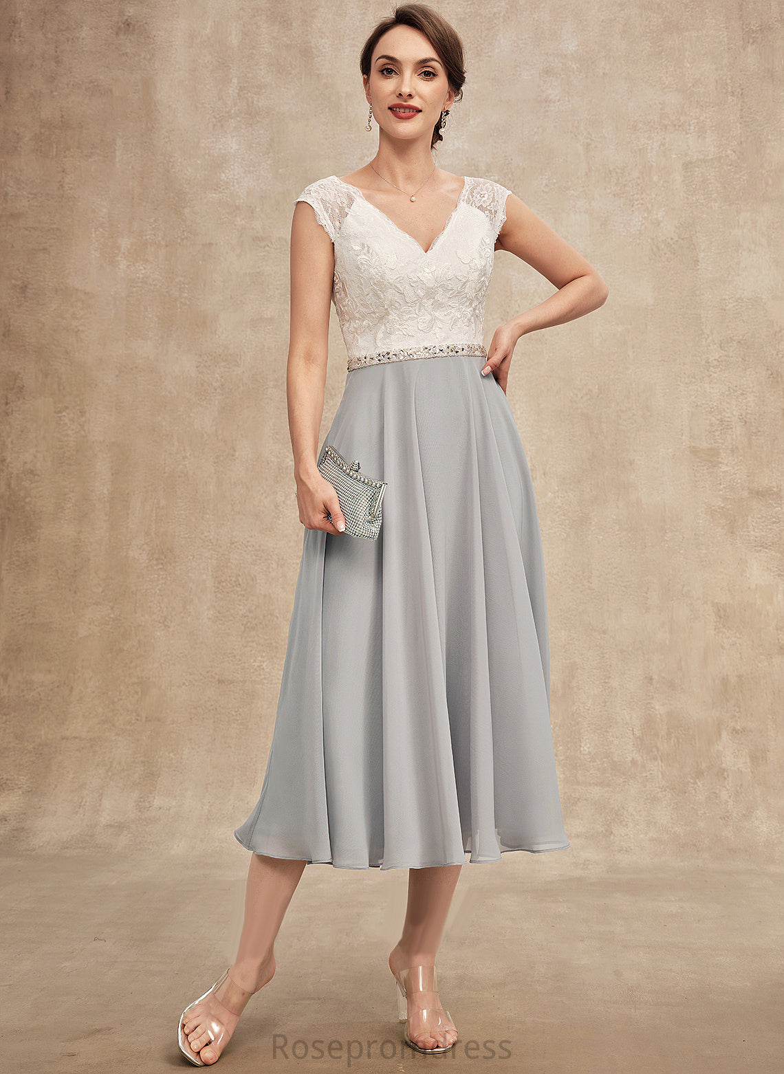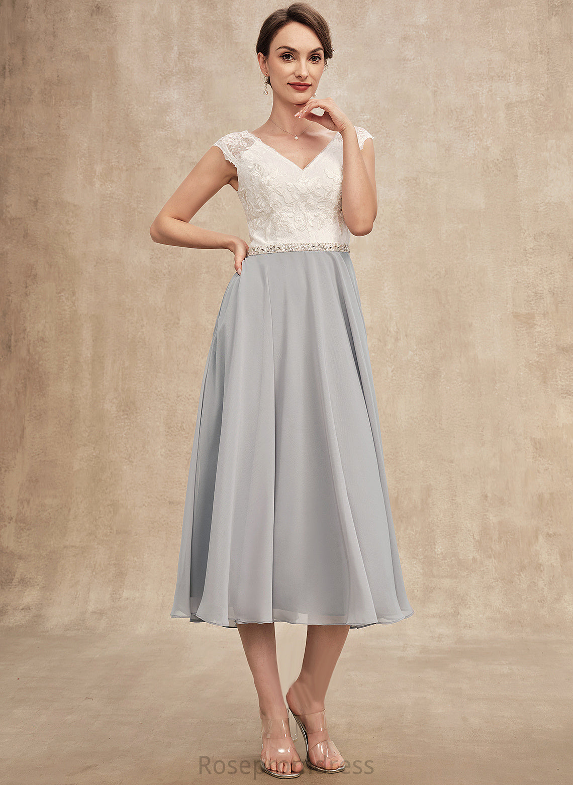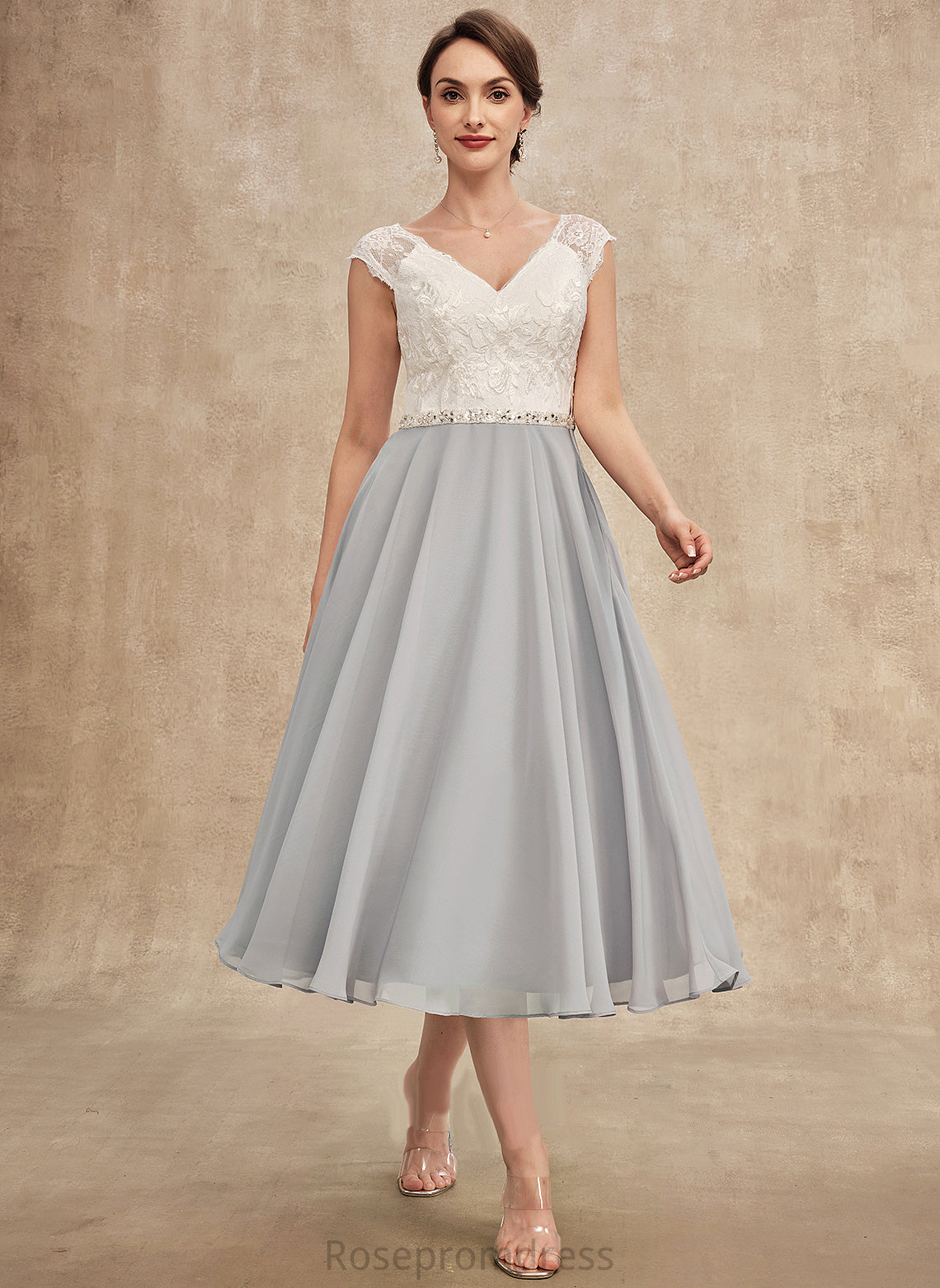 of Mother of the Bride Dresses Lace Beading V-neck With Tea-Length Teresa Mother Bride Chiffon Dress the A-Line