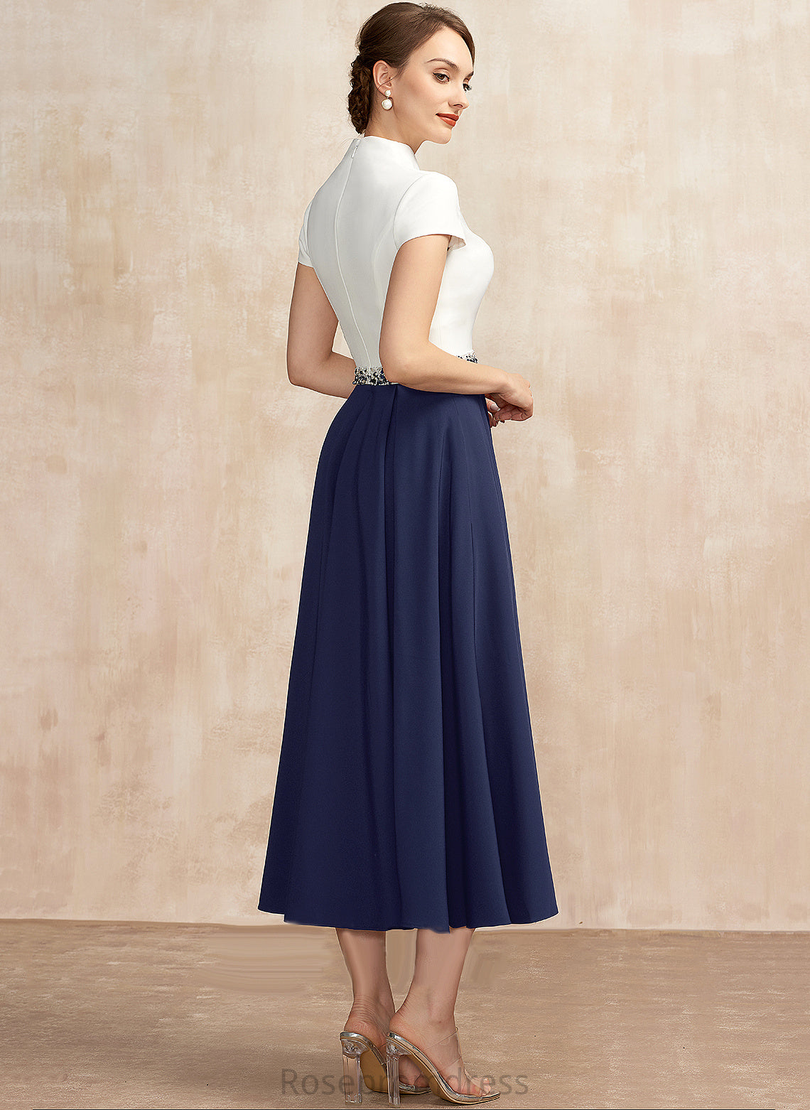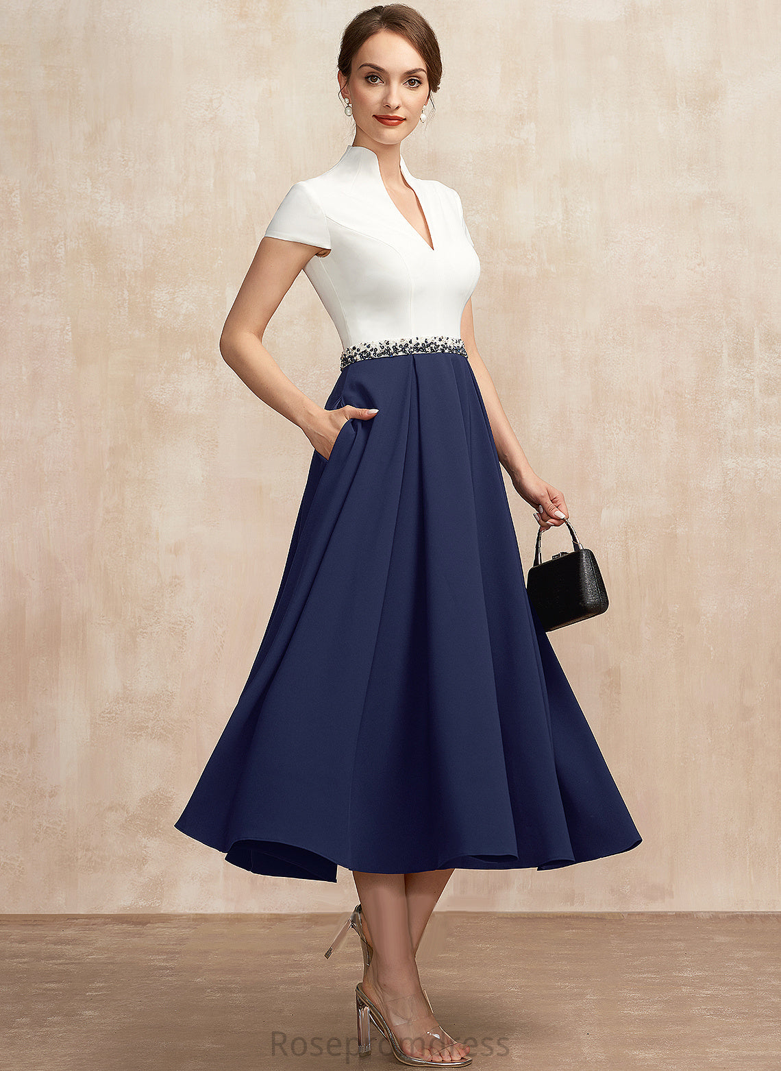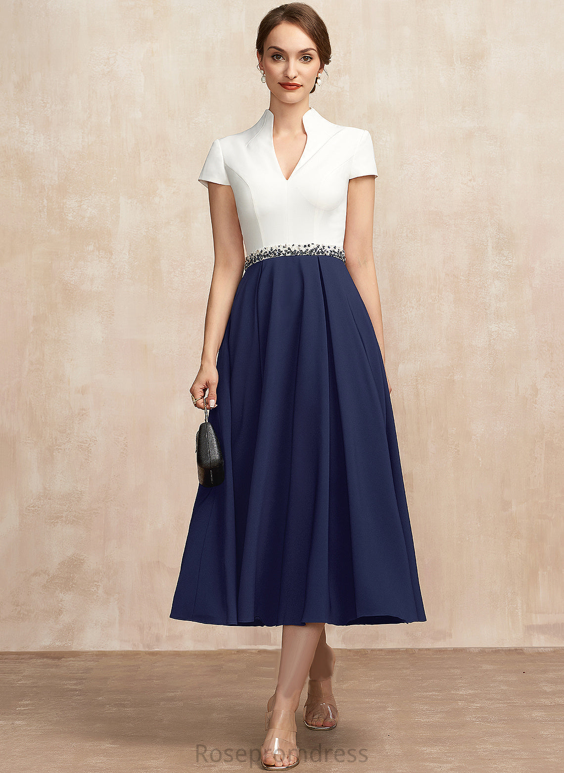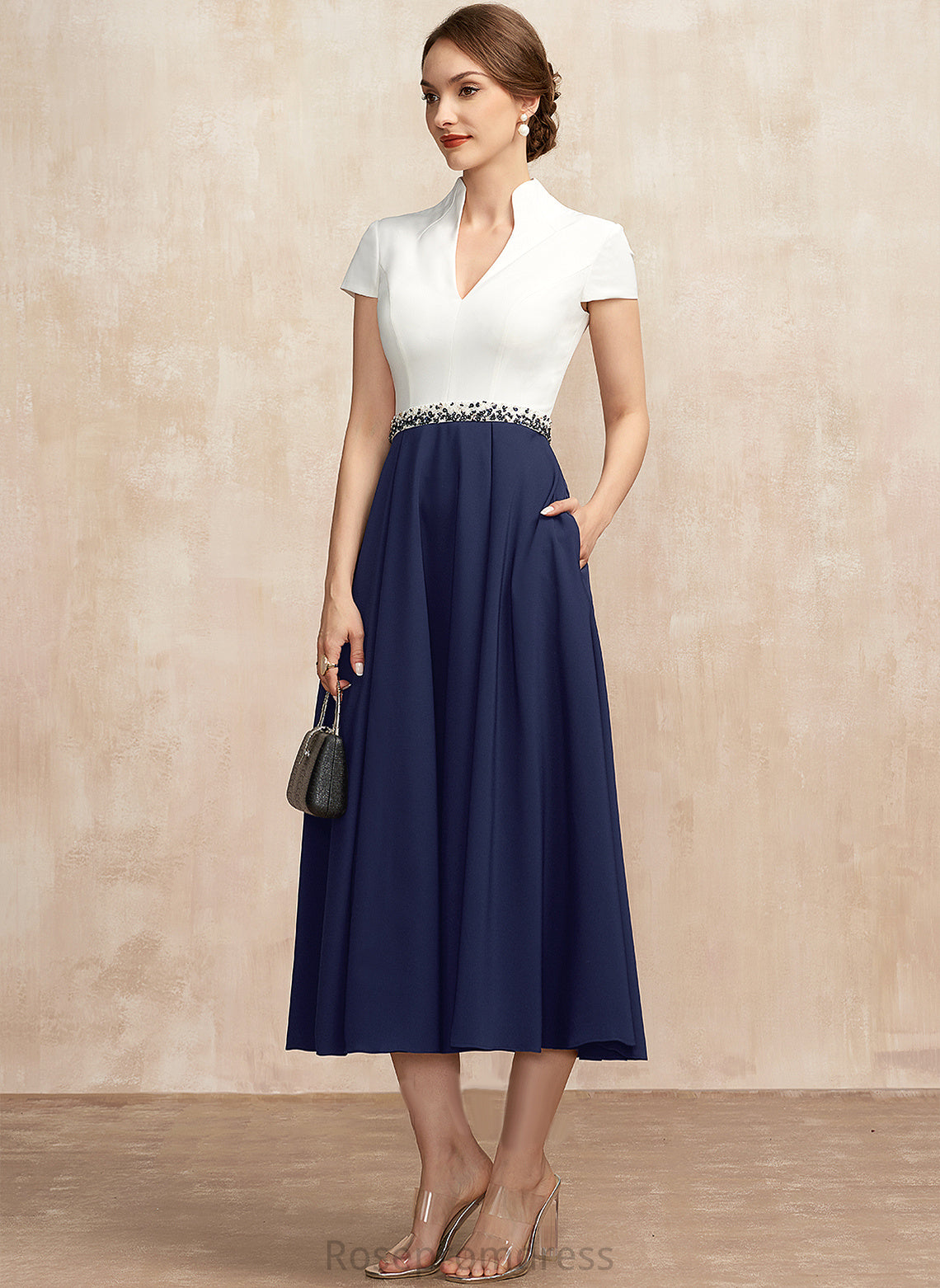 of Mother V-neck Pockets Tea-Length A-Line Crepe With Dress Bride Mother of the Bride Dresses Sequins Adrianna the Beading Stretch