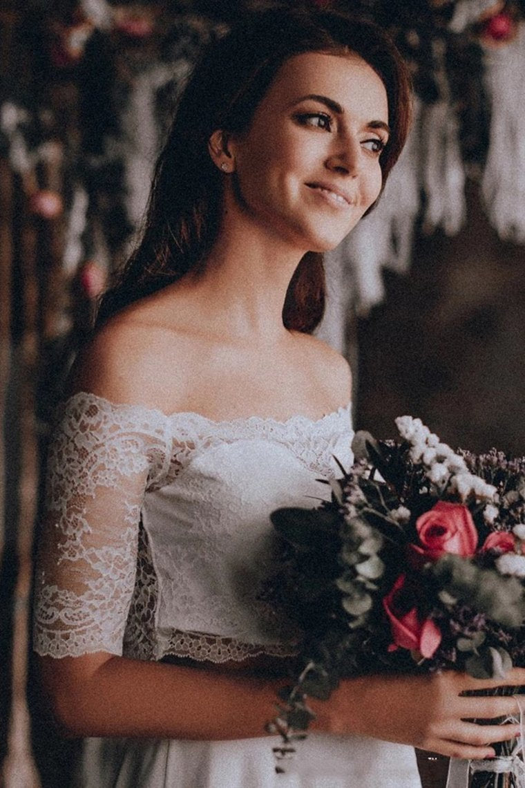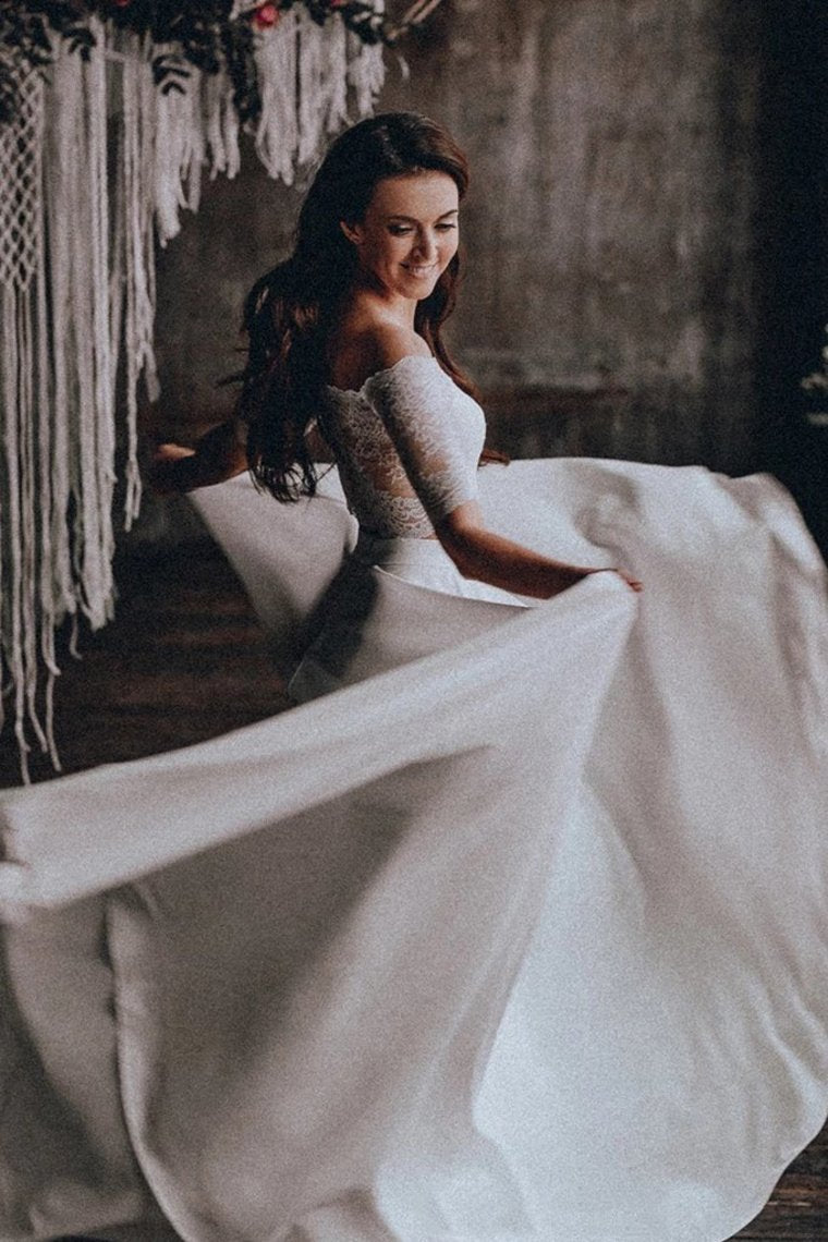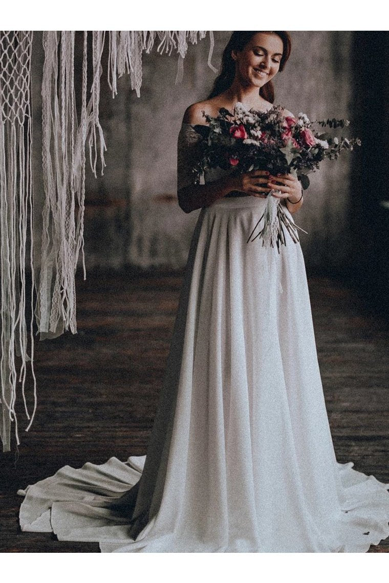 Off Shoulder Lace Top Chiffon Two Piece Beach Wedding Dress With Half Sleeve