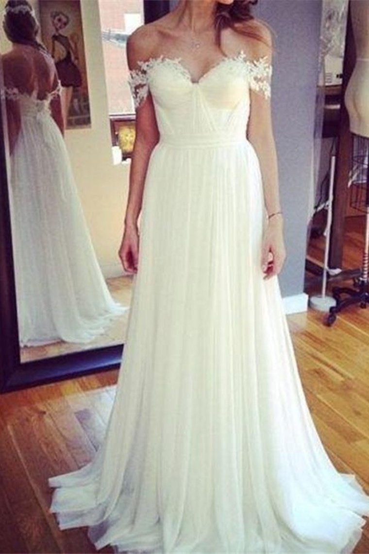 Off The Shoulder Flowy Long Ivory Lace Chiffon Beach Wedding Dresses