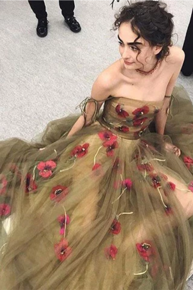 Off The Shoulder See-Through Prom Dress With Flowers Tulle